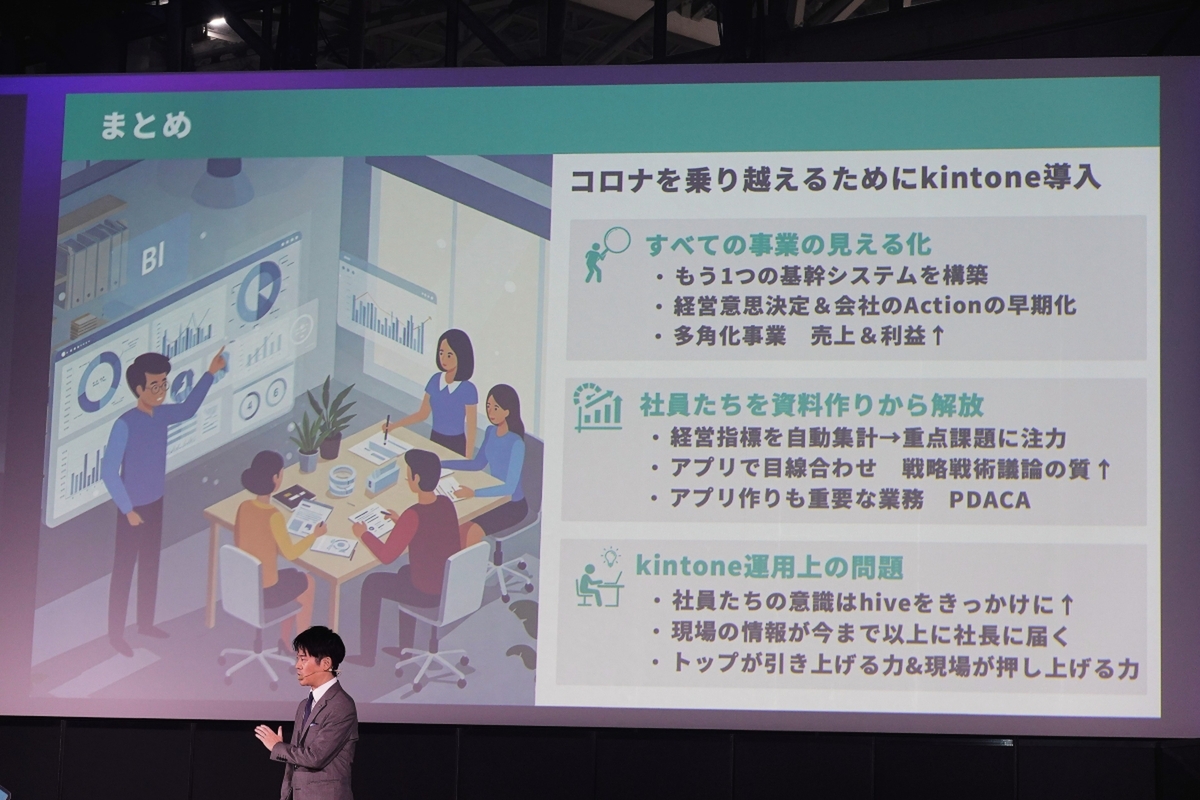 コロナ禍という出口の見えない暗いトンネルの中、kintoneを導入。社員が毎日登録する日報が大野氏の心のよりどころとなり、出口へ向かう道しるべになったという。そして、kintoneによる「見える化」が意思決定を早め、「資料作りからの解放」が議論の質を高め、「PDACA」という経営サイクルを生んだ。そして何より、kintone hiveをきっかけに社員の意識が向上し、「トップが引き上げる力」と「現場が押し上げる力」の両輪が噛み合った。