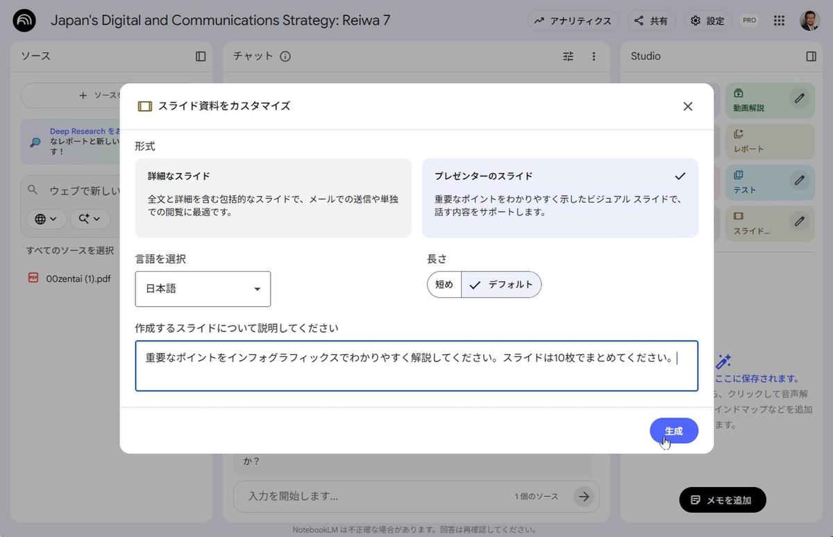 次は、令和7年度版の情報通信白書をスライドにしてもらおう。設定の「形式」で「プレゼンターのスライド」を選択し、プロンプトも入力する。ここでは、「重要なポイントをインフォグラフィックスでわかりやすく解説してください」と指示した。スライドの枚数も10枚と指定。