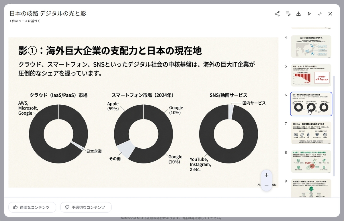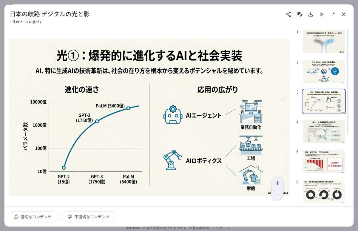 数分で、256ページにも及ぶPDFを分析し、きっちり10枚のスライドにまとめてくれた。ちなみに、NotebookLMはPDFのページ数に関する制限は特になし。1ファイルは200MBまで、1ファイル当たりの最大単語数は50万語(日本語だと100万文字強)となっている。今年の情報通信白書は39MB、約37万文字なので余裕で扱えるのだ。何なら、昨年の分も入れて、差分を抽出させることもできる。