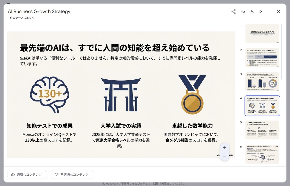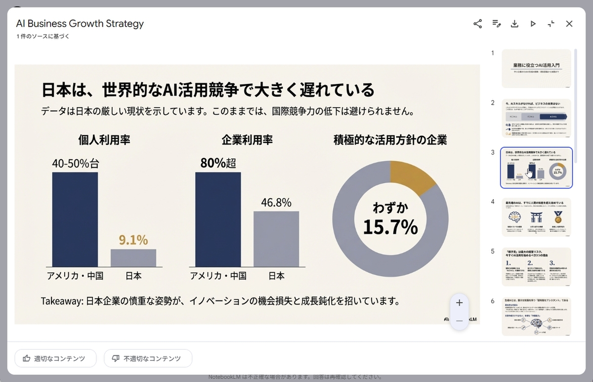 これまでも生成AIでプレゼンスライドを作成することはできたが、デザインがイマイチだったり、日本語のフォントが崩れたりしていた。場合によっては、レタッチツールなどでテキストを差し替える作業が発生していたが、今度の「NotebookLM」は一味違う。そのままビジネスシーンで利用できるクオリティのスライドが作れるのだ。
