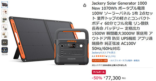 ポータブル電源・蓄電池カテゴリでベストセラー1位を獲得しているJackery(ジャクリ)から、「Solar Generator 1000 New」のソーラーパネルセットが、Amazonタイムセールに登場!