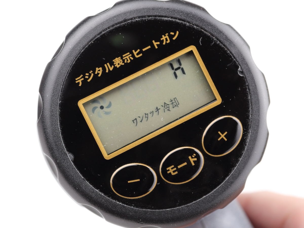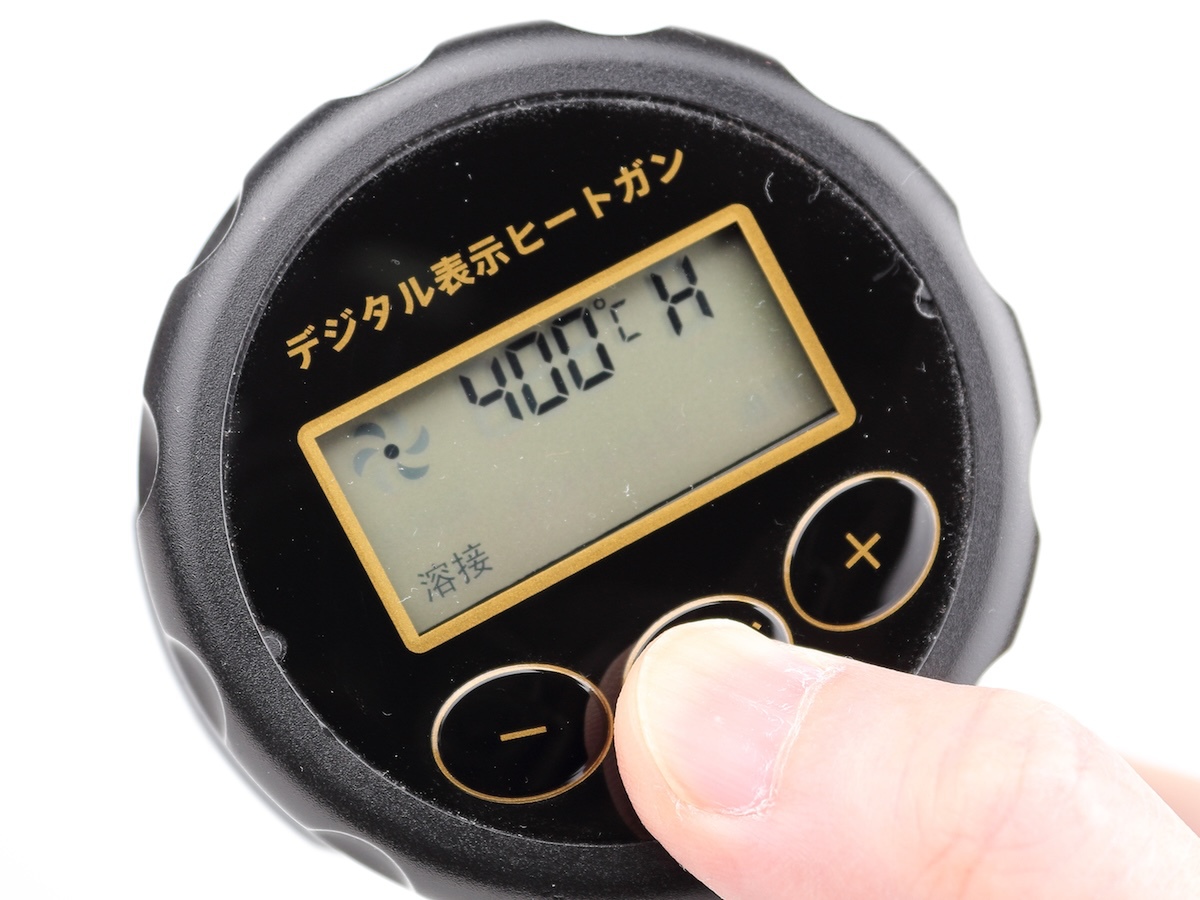 温度設定は液晶画面の下に搭載されている、3つのボタンで行ないます。弱風の場合は+と-のみで、押すたびに10度ずつ変化。強風の場合はモードが有効になり、ボタンを押すたび、通用(100度~)、熱収縮(200度~)、フィルム(300度~)、溶接(400度~)と切り替わります。