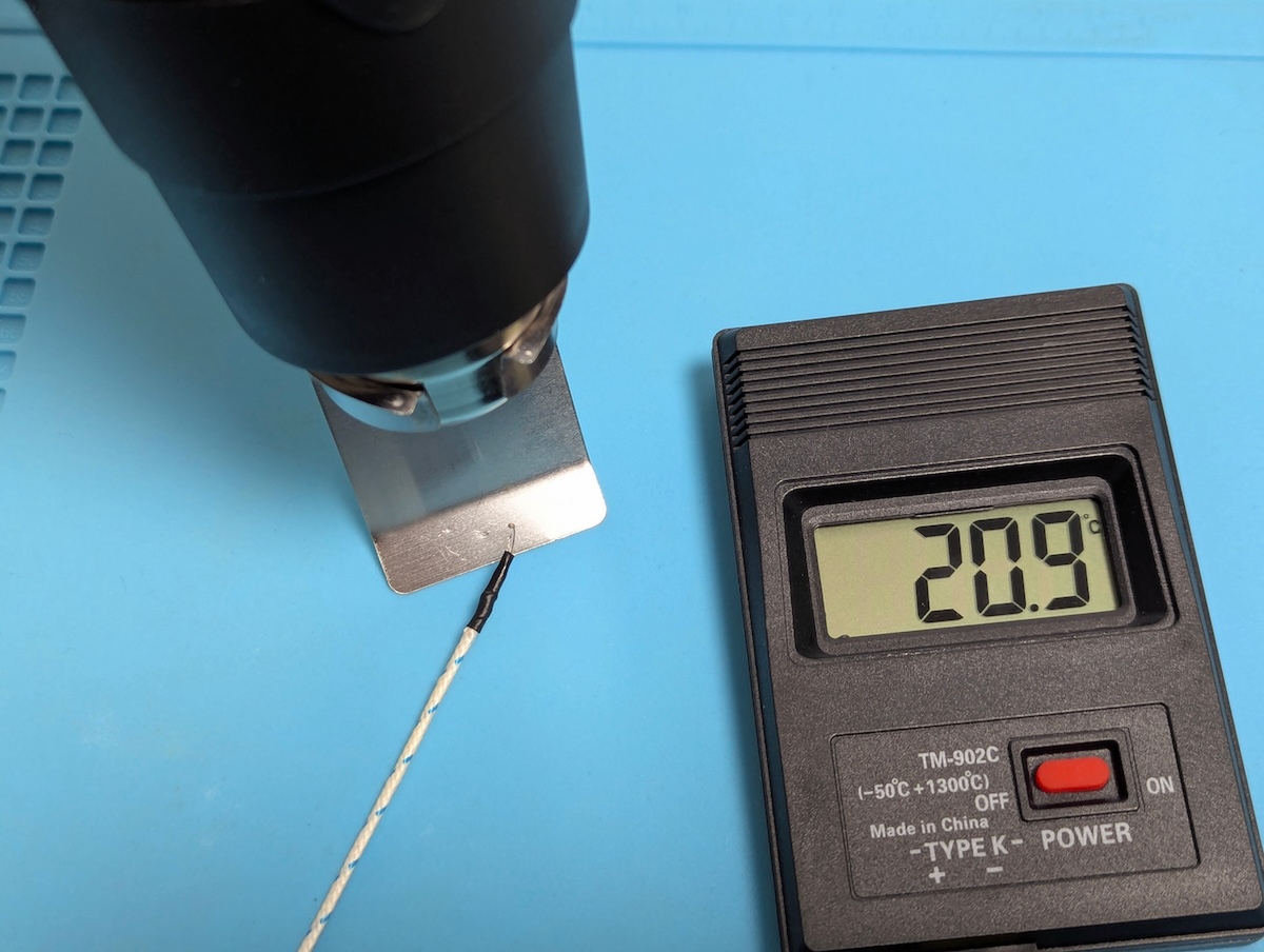 個人的に気になったのは、この弱風と強風で、それぞれどのくらいの温度の風が出てくるのかという点です。吹き出し口の先、約5cmの場所に温度センサーを置き、直接温度を測ってみたところ、300度設定の弱風では約221度、600度設定の強風では約335度まで上昇していました。