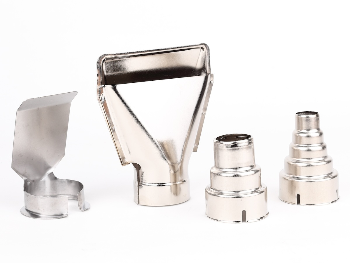 付属のノズルは、曲面ノズル、平面ノズル、丸ノズル(大)、丸ノズル(小)の4種類。曲面ノズルは風向を変えられるので、パイプや竹ひごの曲げ作業などで活躍してくれます。平面ノズルは薄く広く風を当てられるので、シュリンクフィルムなどに最適。丸ノズルは、特定の場所だけ集中的に加熱したい場合に向いています。