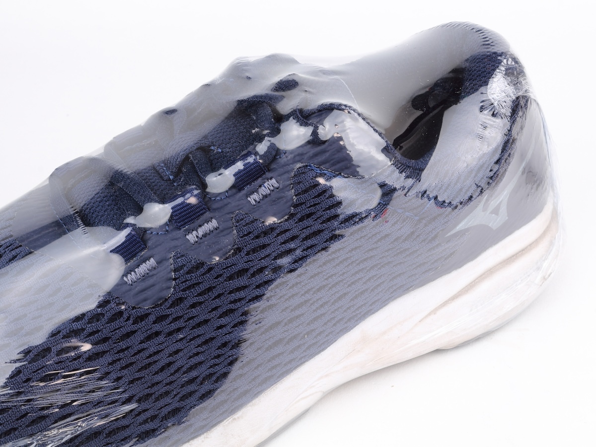 大風量&高温が有利になるのが、より大きなラップフィルムを使う場合。ということで、スニーカー用とあった25×40cmのシュリンクフィルムを試してみましょう。せっかくなので、中に入れるのはスニーカーです。モードはシュリンクモード(300度)としました。