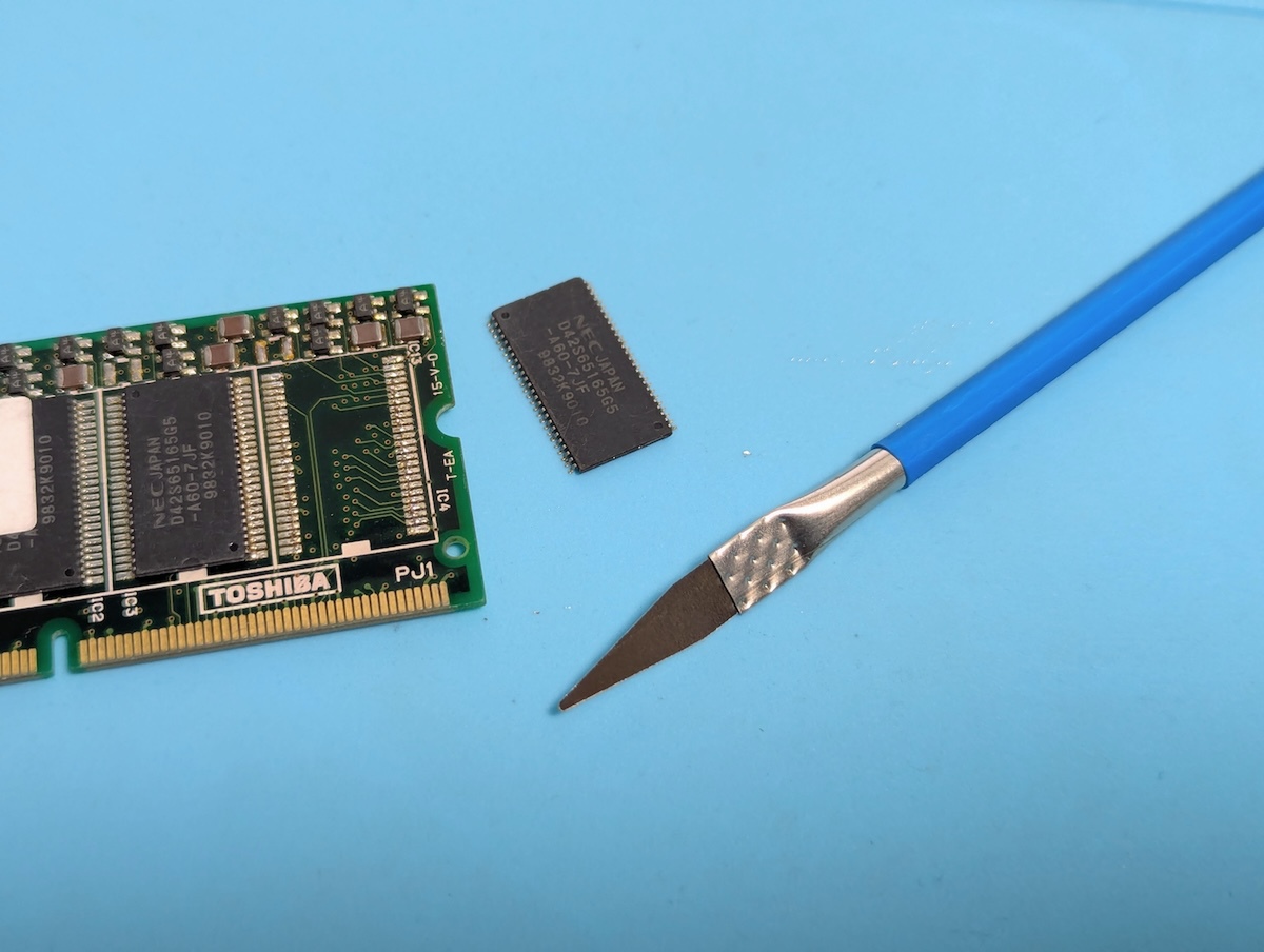 数十秒ほどかけてICを周囲ごと徐々に温め、そろそろかな、というタイミングで足部分を集中的に加熱。パーツの下に薄刃のツールを挿し込んで持ち上げたところ、スッと抵抗なく無傷で剥がせました。ただし、直後に風にあおられ、ICが吹っ飛びましたが。