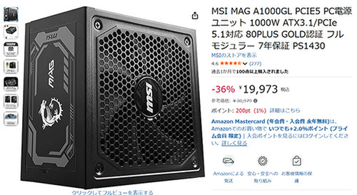 【Amazonセール】MSI PC電源ユニット「MAG A1000GL PCIE5」(1000W)登場!