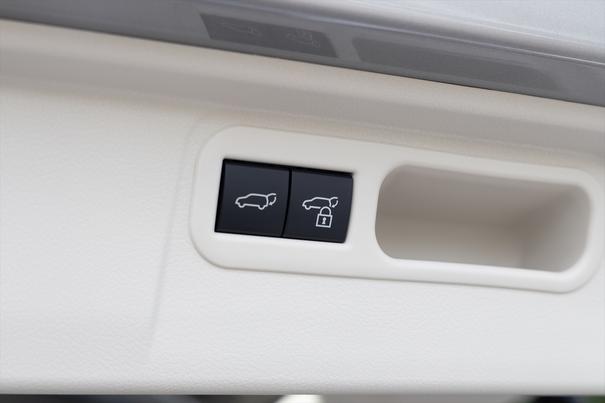 バックドアに回って収納を確認しようとするゆみちぃ部長。バックドアパネルを開けようとしても、パワーゲートが動きません。「これ、壊れていますよ?」と不安な顔に。いいえ、トヨタは横にスイッチを設けています。一説によると、人がバックドアと壁に挟まれるのを防ぐためだとか。
