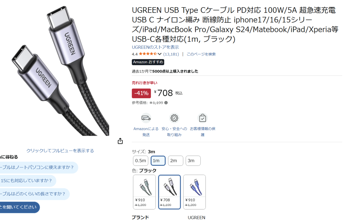 「UGREEN USB Type Cケーブル PD対応 100W」はAmazonブラックフライデーのセールでも人気だった商品で、過去1か月で5,000点以上購入されたそうです。それが現在でも708円で買えるのはうれしい機会です。まとめ買いも良いかもしれませんね!