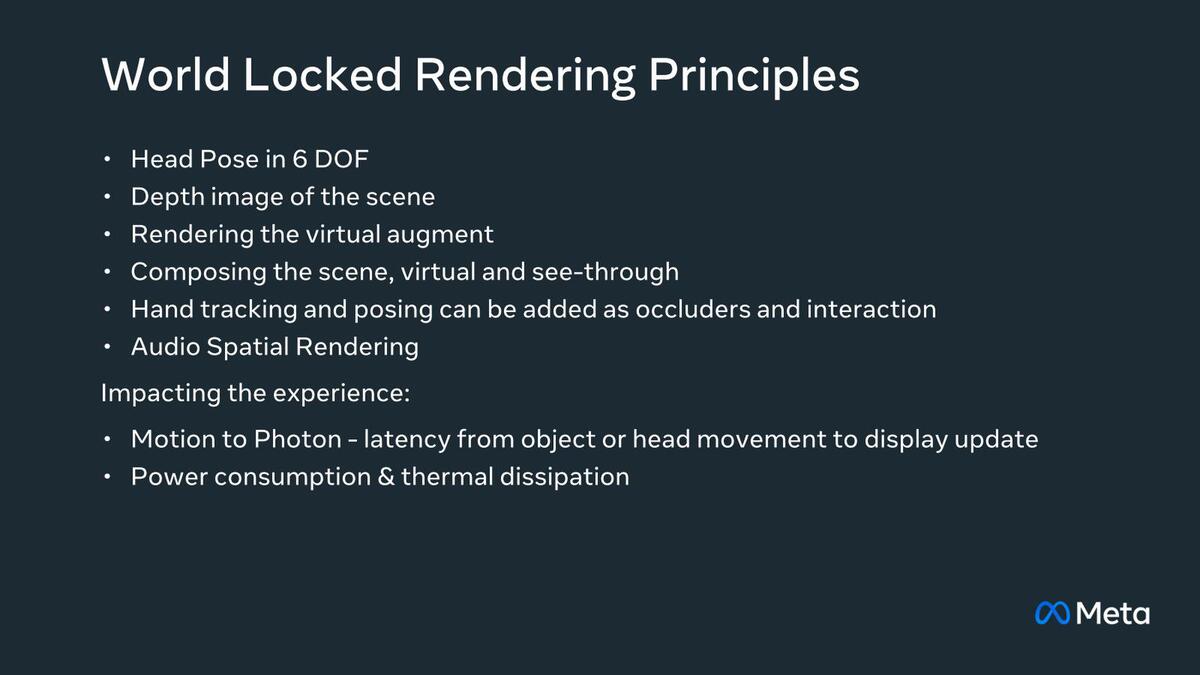 さてOrionはARグラスであり、WLR(World Lock Rendering)を実現するためのデバイスである。WLRを簡単に説明すれば、仮想のオブジェクトを現実世界の特定の場所に固定(Lock)し、ユーザーが頭を動かしてもそのオブジェクトが常に同じ位置に見えるようにする技術である。