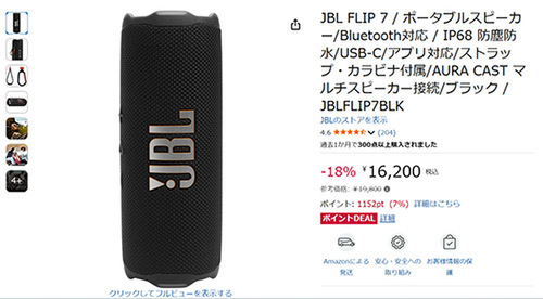 JBLのポータブルスピーカー「JBL FLIP 7」がAmazonセールに登場しました。参考価格19,800円のところ、18%オフの16,200円とお買い得です。