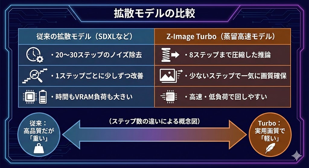 Z-Image Turboの最大の特長は、画像生成に必要な計算ステップ(推論ステップ)が極端に少ない点だ。一般的な高品質モデルであるSDXLなどは、ノイズ除去処理に20〜30ステップ以上を要する。一方でZ-Image Turboは、わずか8ステップで実用的な画質に到達するという。