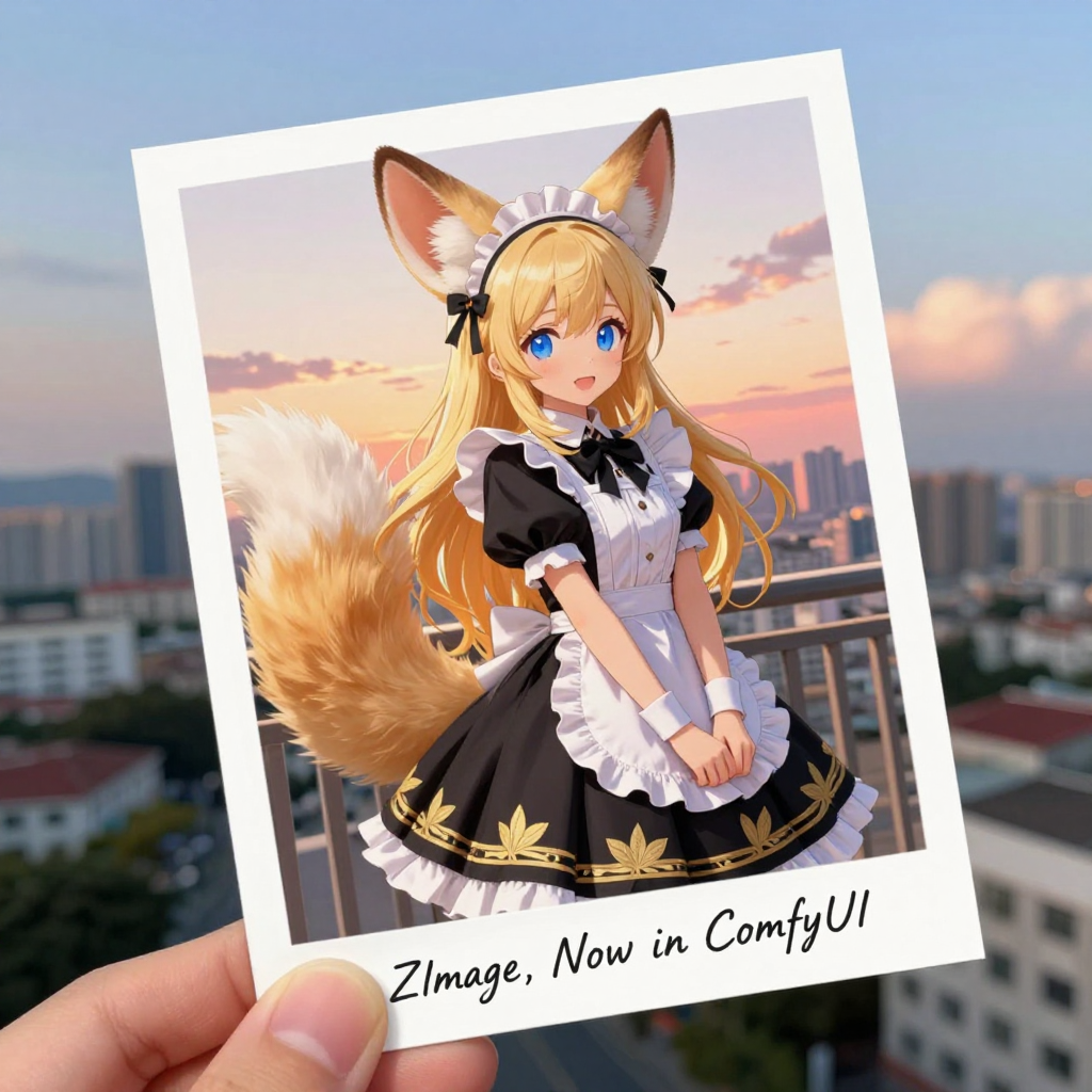 プロンプト:cute anime style girl with massive fluffy fennec ears and a big fluffy tail blonde messy long hair blue eyes wearing a maid outfit with a long black gold leaf pattern dress and a white apron, it is a postcard held by a hand in front of a beautiful realistic city at sunset and there is cursive writing that says "ZImage, Now in ComfyUI"
