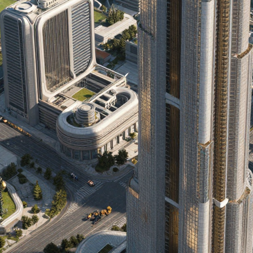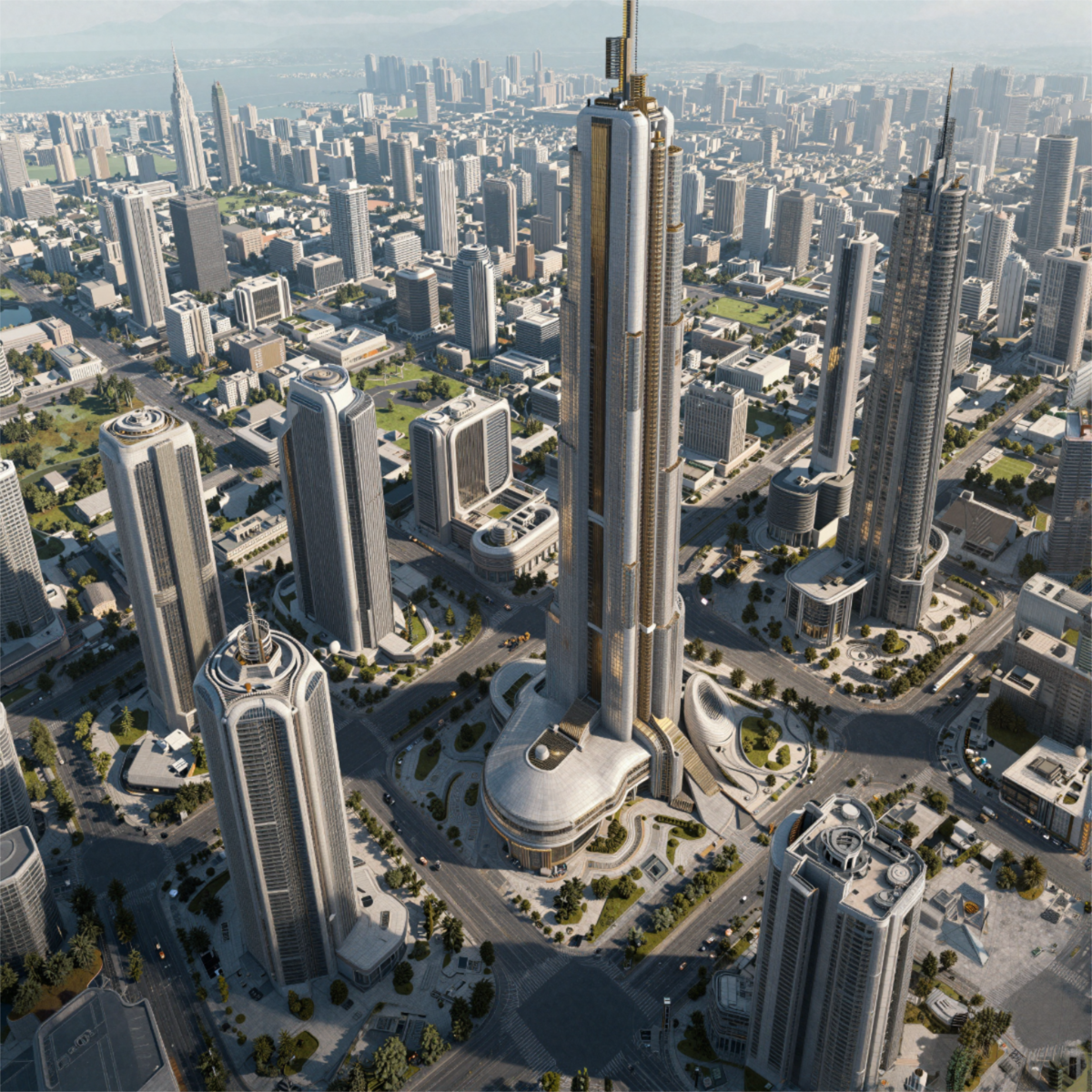プロンプト:A detailed landscape of a futuristic city viewed from above, wide-angle perspective, complex lighting, atmospheric depth, high-detail buildings, 2048x2048 output, crisp and sharp rendering
