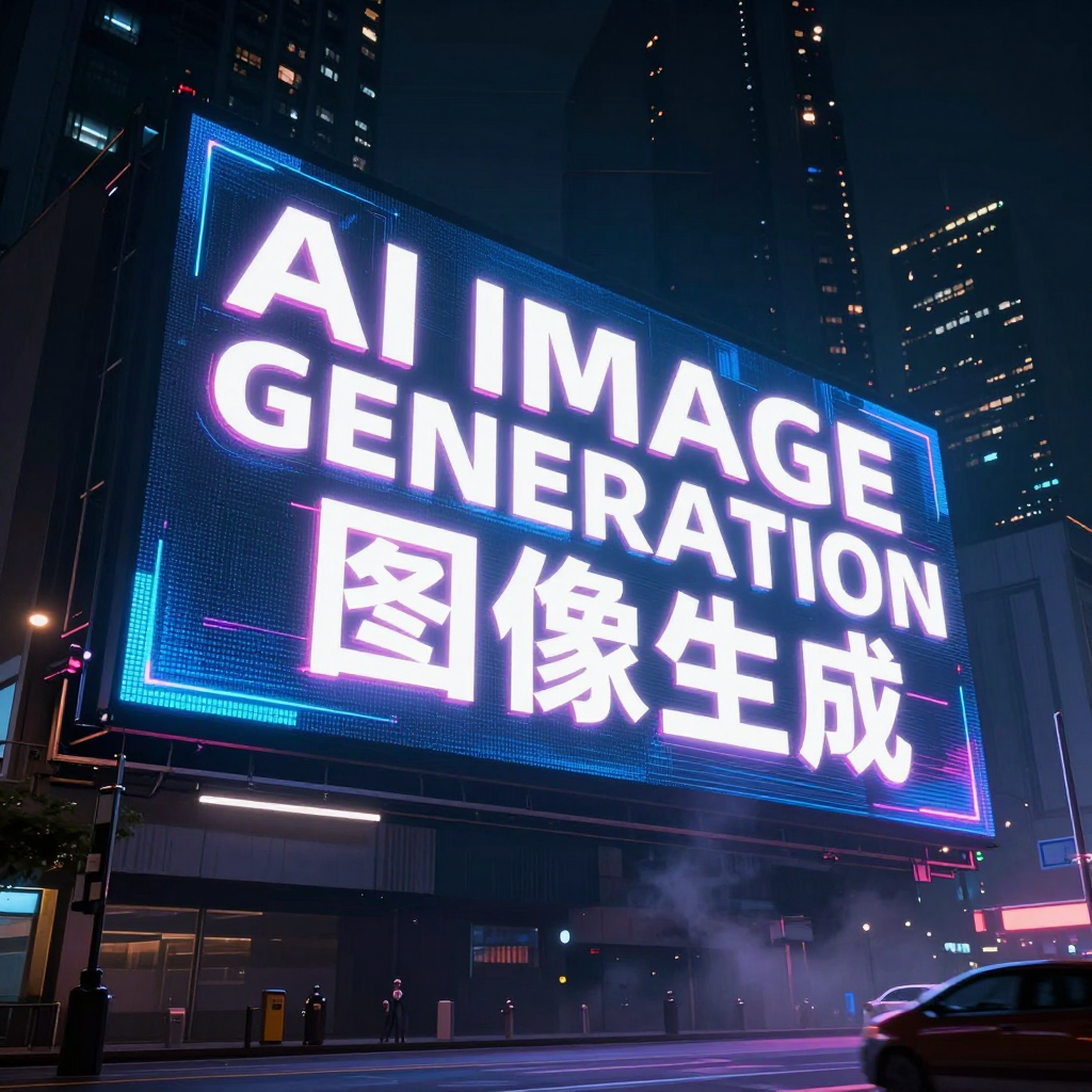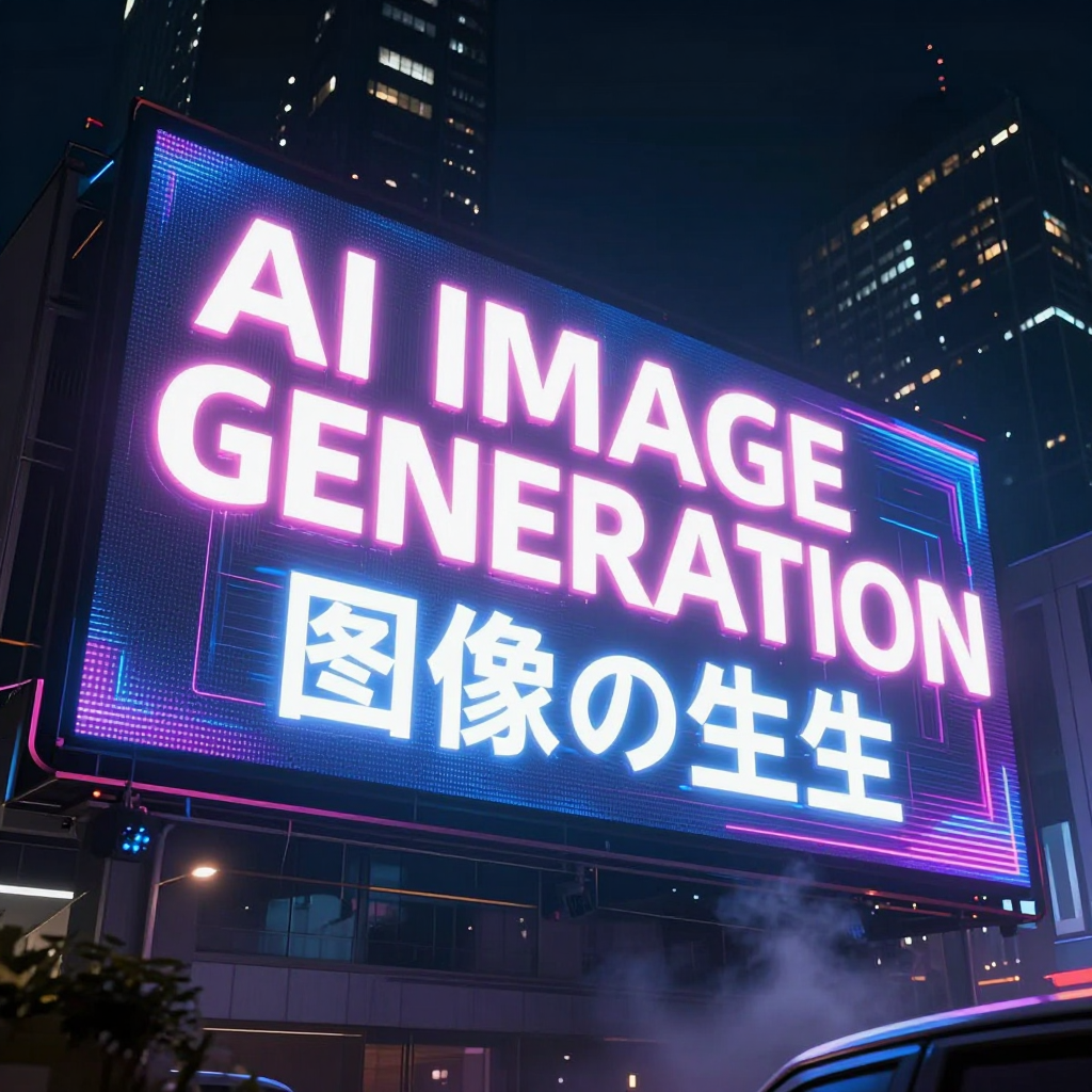 Z-Image Turboは、画像内の文字描画において比較的破綻が少なく、英語や中国語などのアルファベット・漢字系テキストが安定しやすい。バナー制作やSNS用画像など、文字を含むグラフィック用途でも扱いやすい点が特徴だ。実際に英語と中国語で描かれたビルボードを生成してみよう。