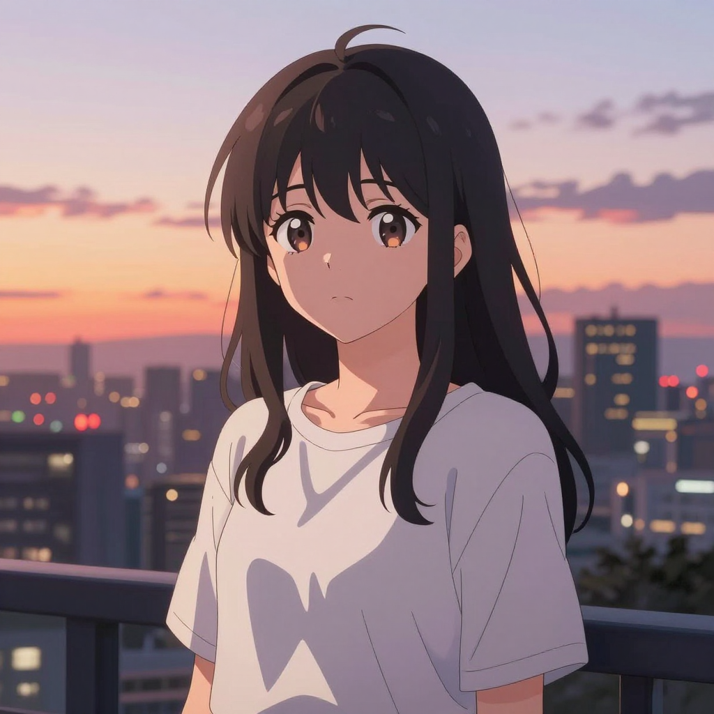 プロンプト:An anime-style illustration of a girl standing in front of a city skyline at sunset, clean line art, vibrant lighting, soft shading, detailed hair and eyes, modern Japanese animation style
