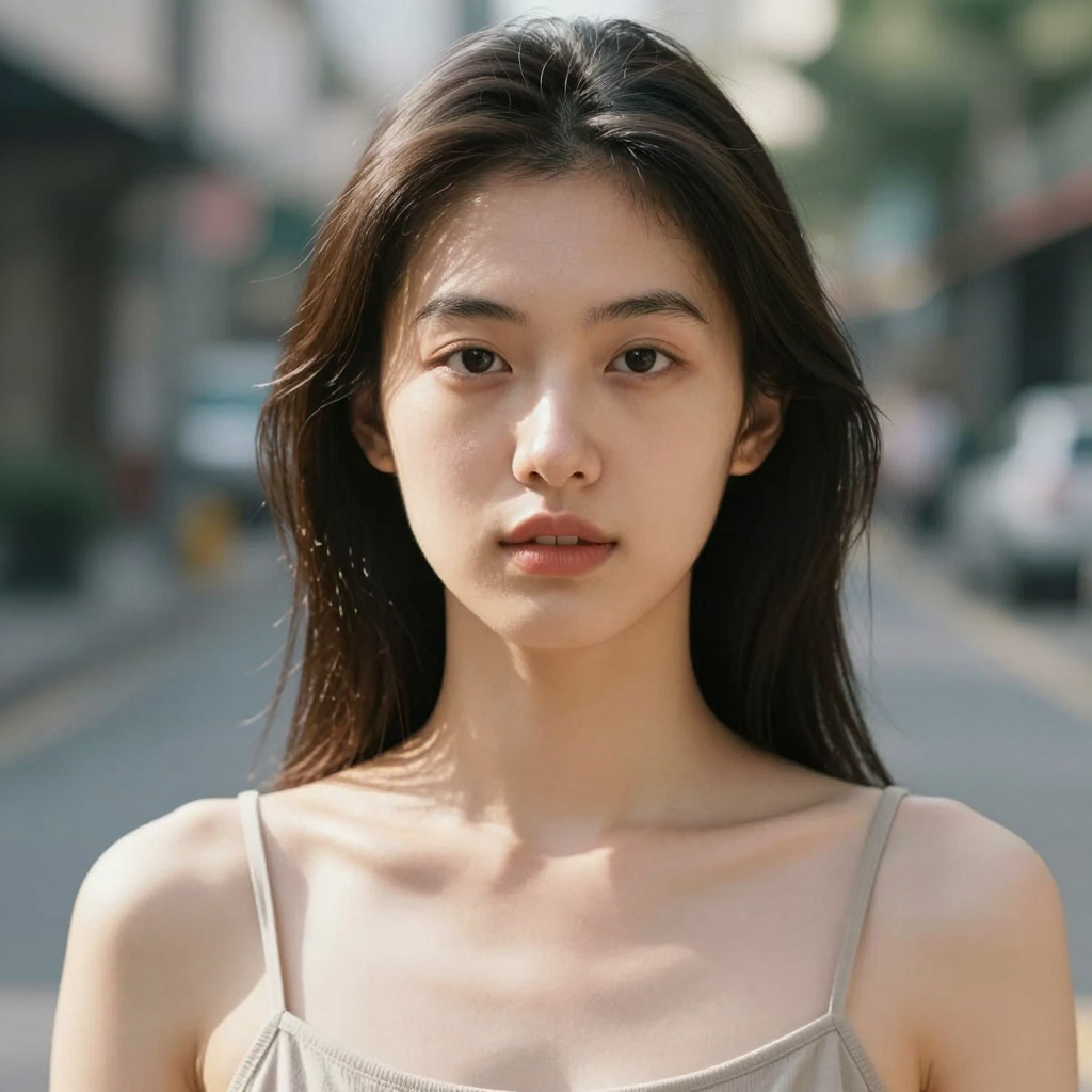 プロンプト:A portrait photo of a young woman in natural light, 35mm lens, shallow depth of field, soft shadows, realistic skin texture, neutral expression, street background, high-quality photography style