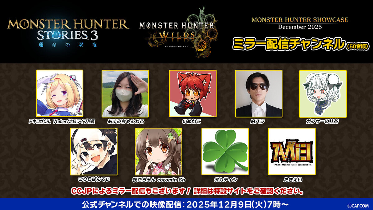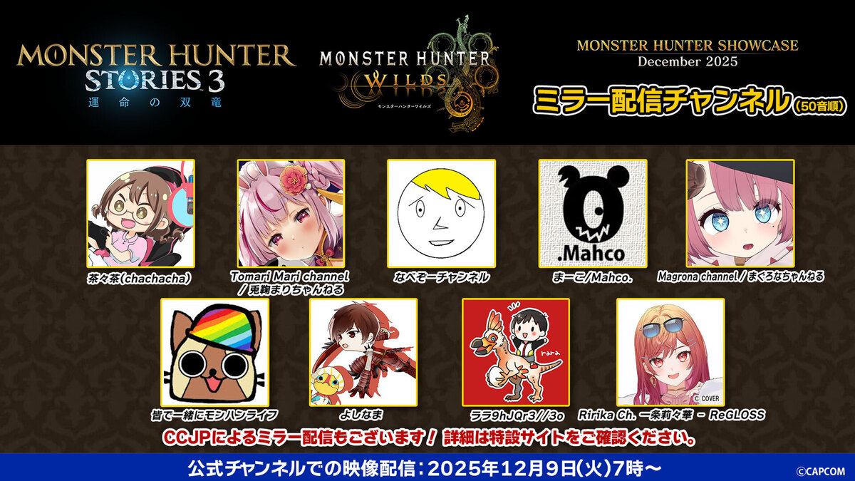 「モンスターハンターショーケース」12月9日朝7時から 「ストーリーズ3」と「ワイルズ」の2本立て 恒例のミラー配信チャンネルも発表
