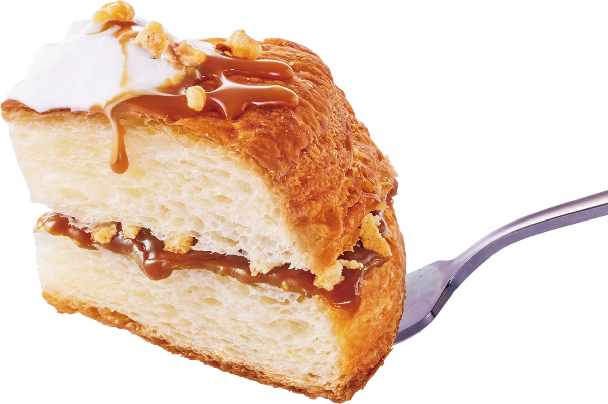 温かいデニッシュの間に、ほろ苦いキャラメルペーストとクラッシュしたサブレを挟み、ひんやりソフトクリームの上からは、コク深いキャラメルソースをかけた一品。