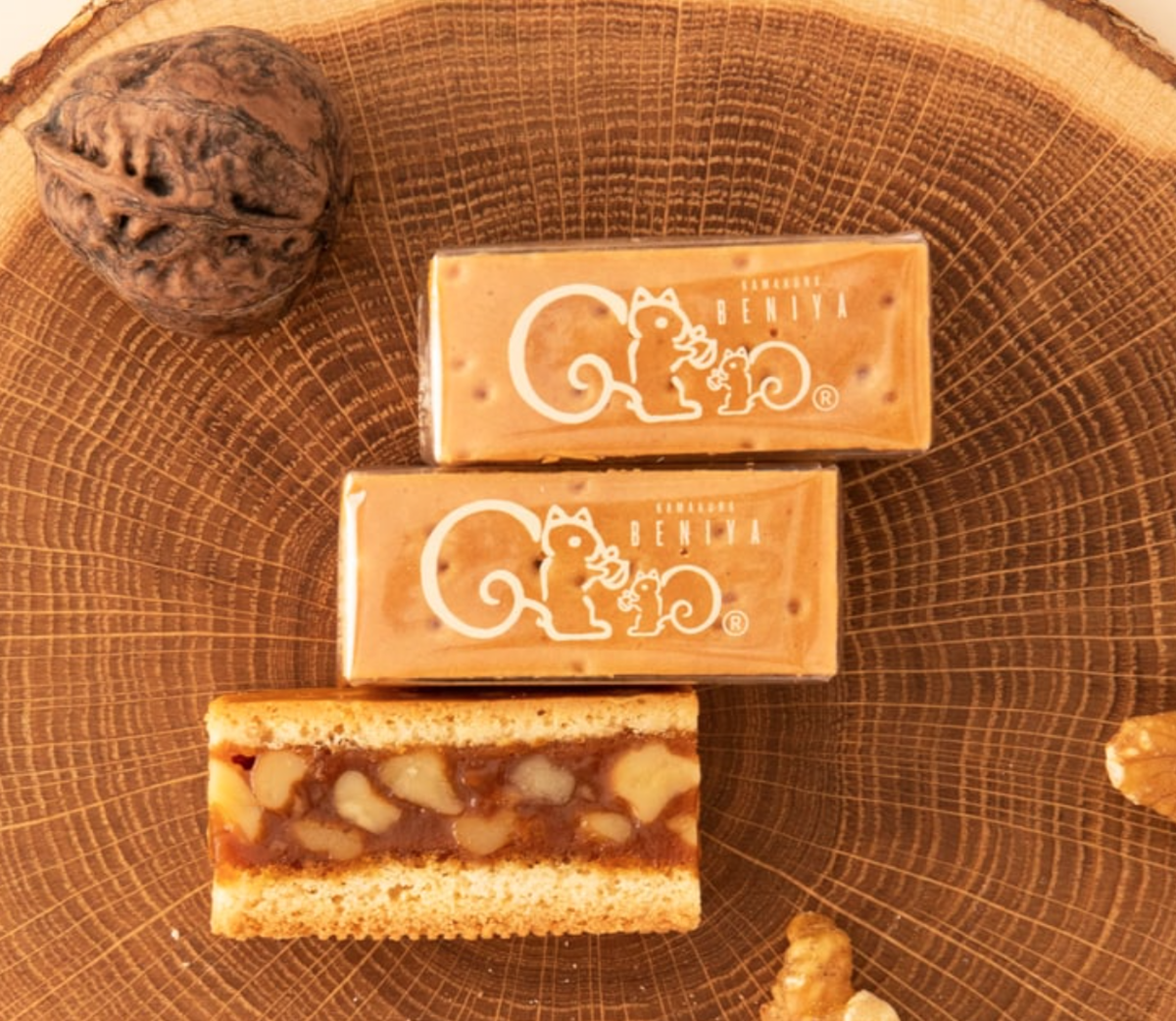 鎌倉紅谷の「クルミッ子」は、ほど良い甘さのキャラメルとクルミの絶妙なバランスや、バターの風味豊かな生地が、全体を調和させた銘菓。シンボルキャラクター「リスくん」も人気だ。