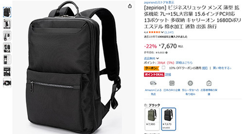 zepirion(ゼピリオン)のビジネスリュック「Expack」が、Amazonセールに登場しました。参考価格9,800円のところ、22%オフの7,670円とお買い得です。