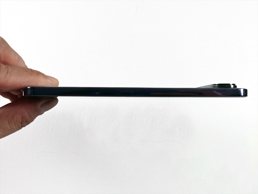 最大の特徴である本体の厚みは、最薄部が5.9mm、最厚部が6.7mmとのこと。iPhone Airの5.6mm、Galaxy S25 Edgeの5.8mmには及ばないものの、十分な薄さを感じさせる。