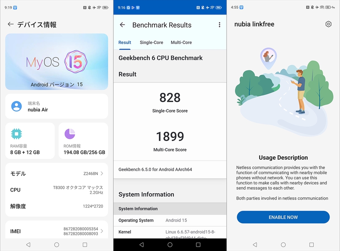 また、nubia独自のアプリとして「nubia linkfree」がプリインストールされている。これはBluetoothを使うことで、携帯回線がオフだったり電波状態が悪い時でも、nubia端末同士で音声通話やメッセージの送受信が可能なアプリだ。