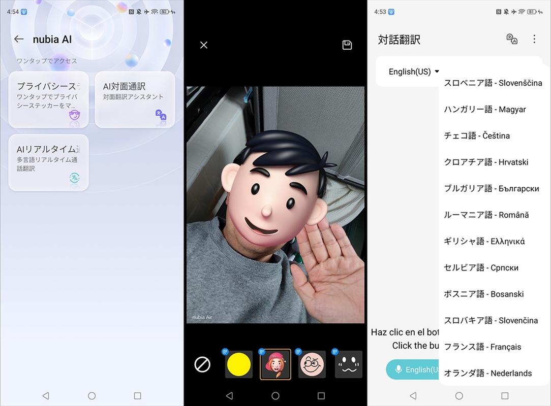 AI機能に関してはグーグルのGeminiが利用可能。nubia Air独自のAI機能として、写真にスタンプなどを押して顔を隠すプライバシー保護を目的とした「プライバシースタンプ」、外国語関連として「対面翻訳」「リアルタイム通話翻訳」も搭載。ただし、翻訳対象言語は現時点ではヨーロッパ言語のみとなっている。