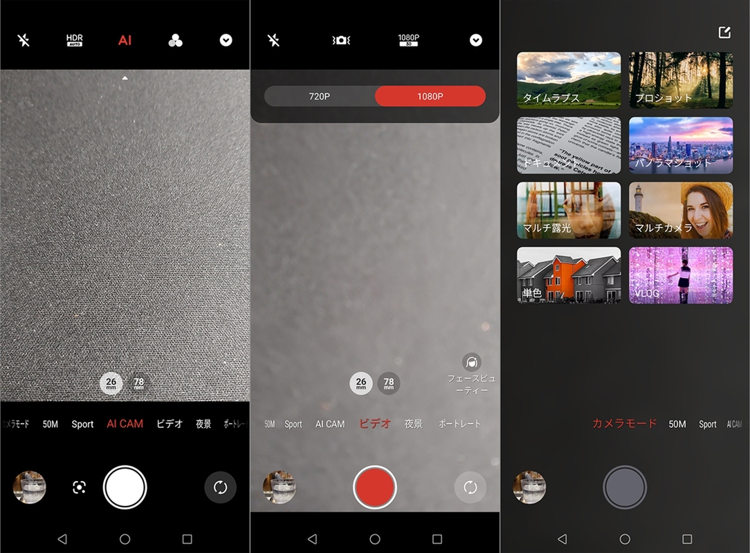 カメラのUIは、カメラフォンのZシリーズと同等だ。ウォーターマークは文字のみを入れることができる。実質5000万画素広角のみというシングルカメラ構成のため、カメラのUIはシンプルだ。