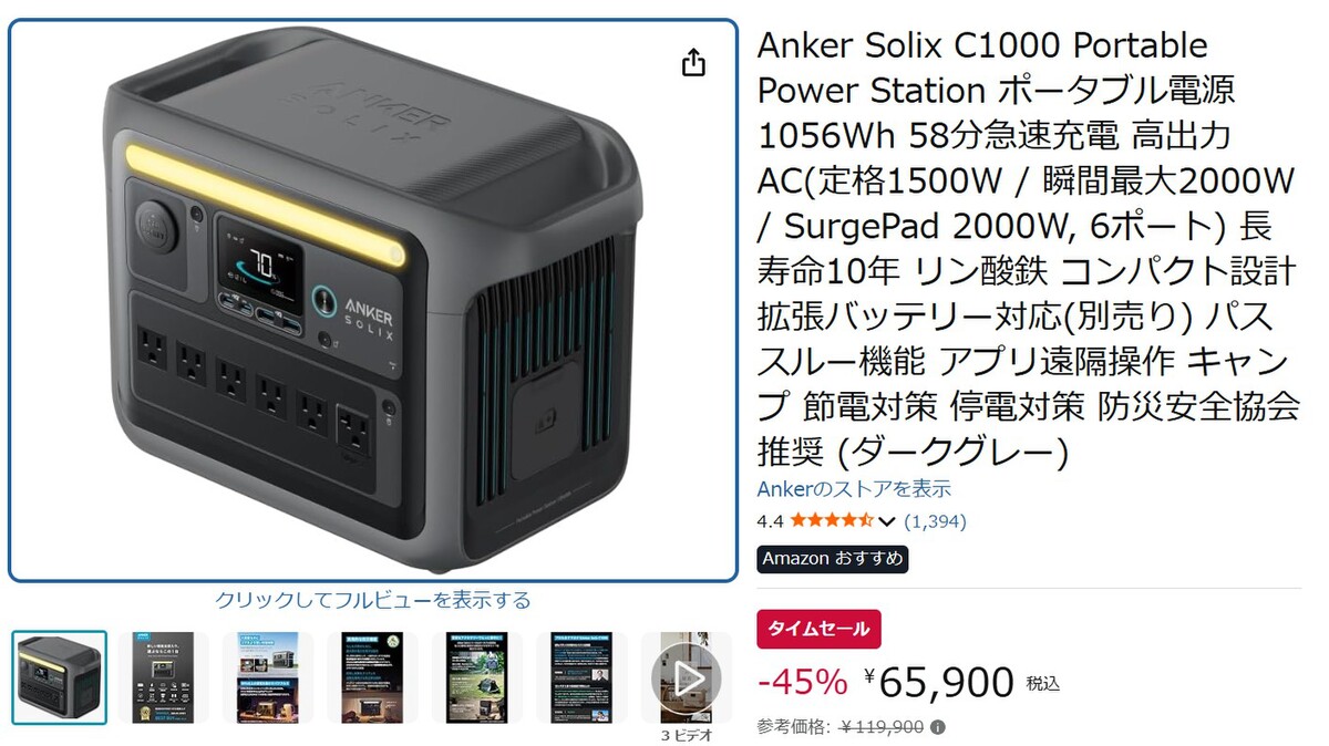 「Anker Solix C1000 Portable Power Station」の参考価格は119,900円ですが、タイムセールでは45%オフの65,900円という大幅割引価格で手に入ります。