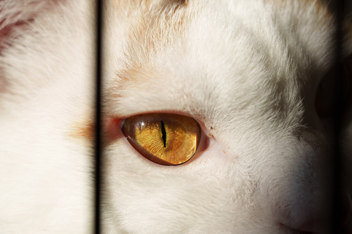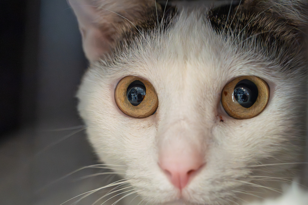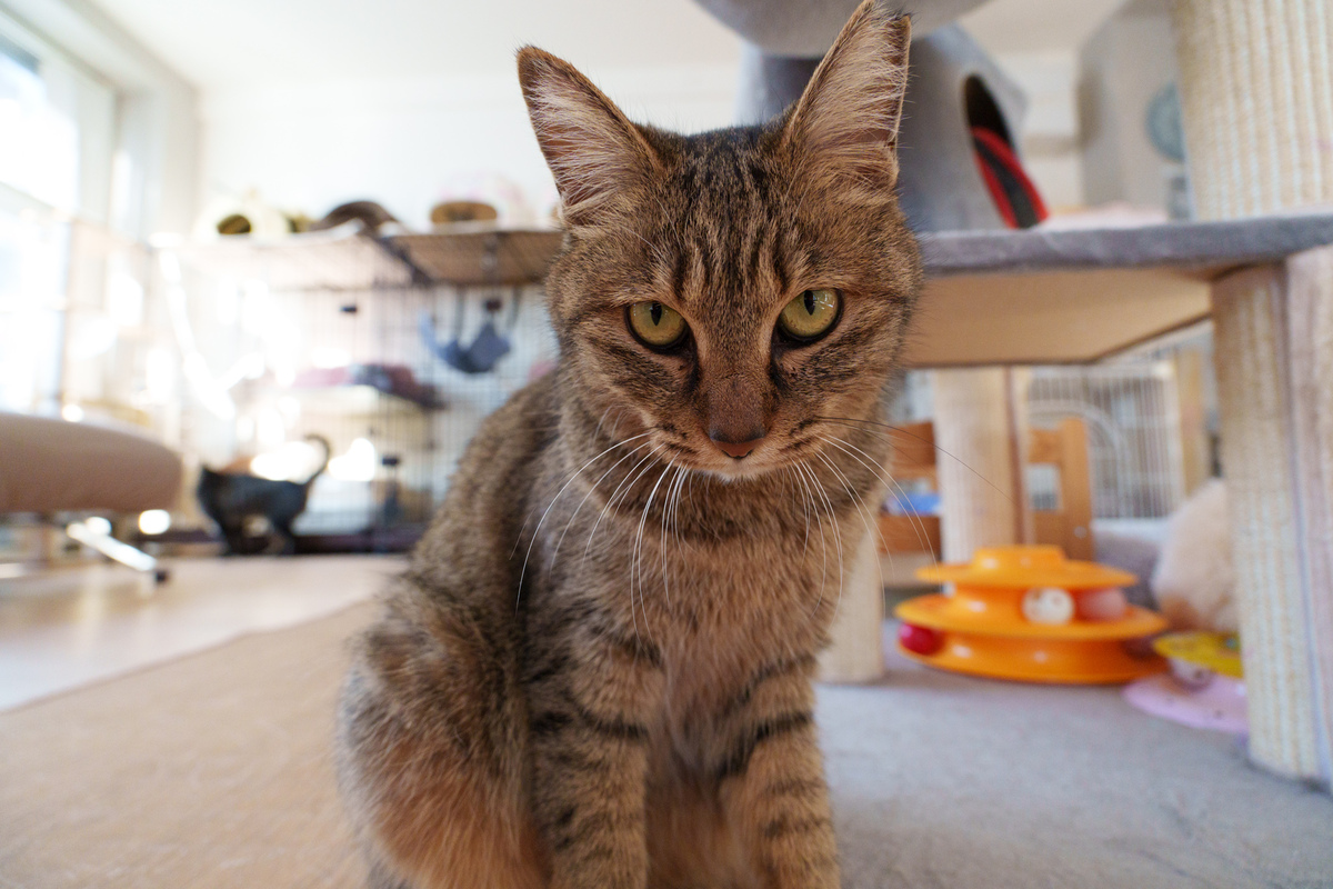 せっかくなので最後にもう1枚顔のアップを。まだ人慣れしてない猫でケージの奥に隠れていたので、ちょいと薄暗く、瞳孔もちょっと大きい。同じ時間帯の同じ部屋の中でも、ちょっとした明るさの違いでこれだけ違いが出るのだ。