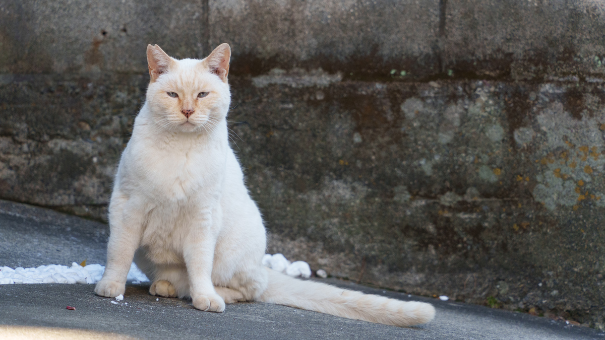この顔が薄い茶色のこの猫、近所のガレージにちょこんと座っていたのだ。こちらは200mmで。普通の座り姿なのだけど、尻尾がにょろんと伸びているのが妙になまめかしかったので冒頭写真にしてみた。