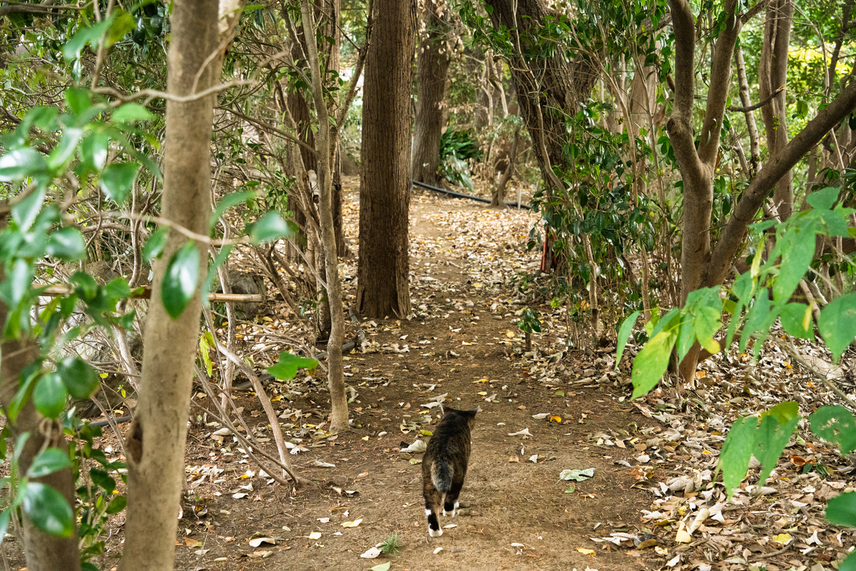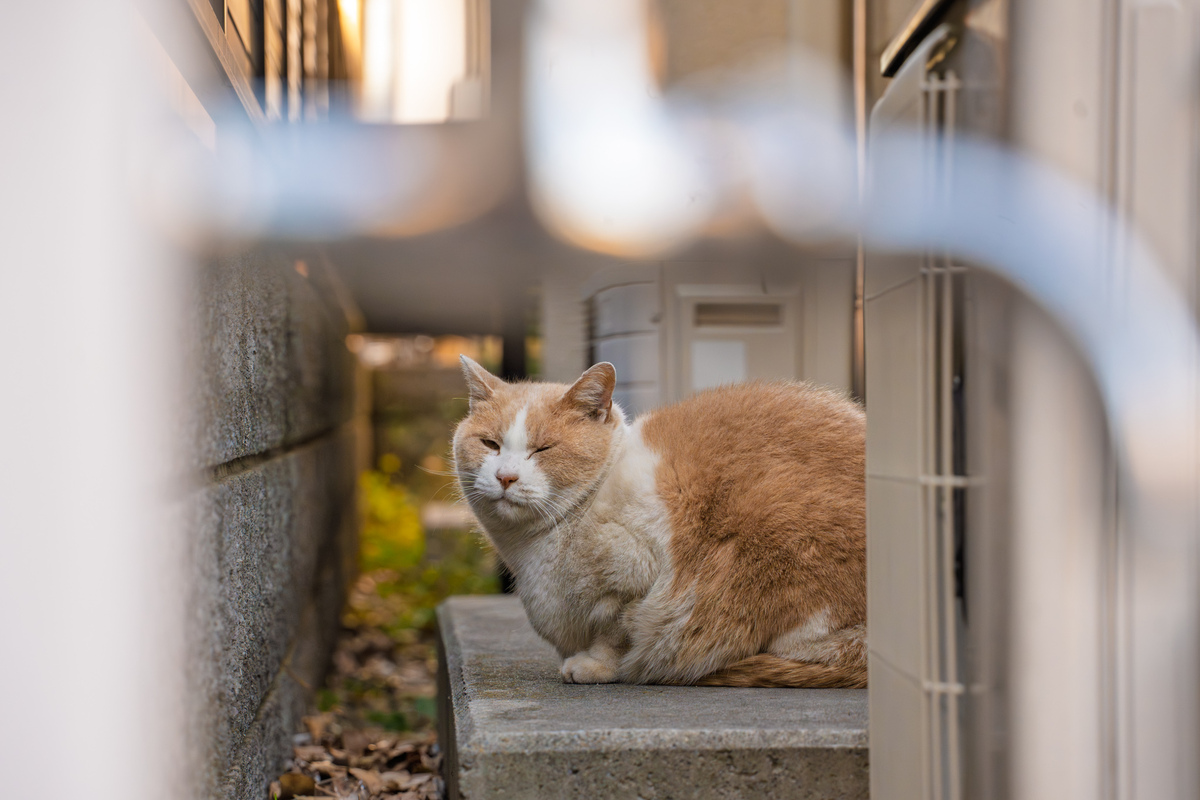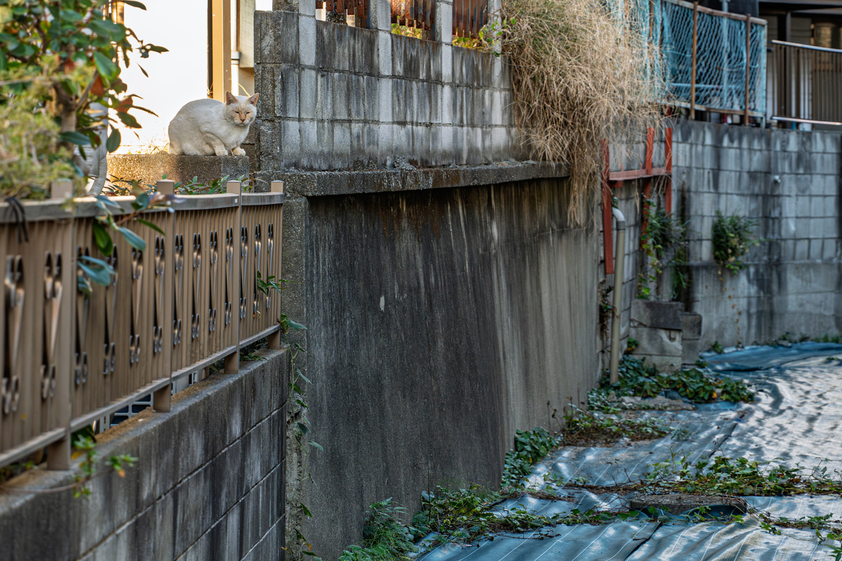 せっかくなので、ちょっとした日常の外出時もこのセットを持ってでかけるようにしてみたら、いい感じで猫と遭遇。それも閉鎖されて人が入れない暗渠沿いの擁壁の上。200mmまで伸ばすと暗渠感が薄れてしまうので、ちょっとひかえめに、立入禁止な暗渠の雑然とした感じが残るようにしてみた。