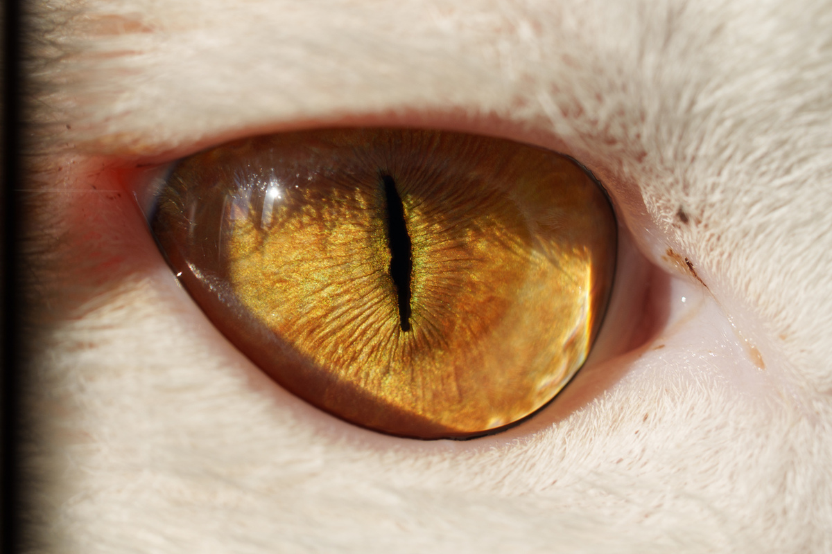 どのくらい細かいところまで写っているのか。この写真をさらにトリミングして、瞳部分をアップにしてみた。ちょうど西日が入ってたので、瞳孔が超細くなってるのがよくわかる。