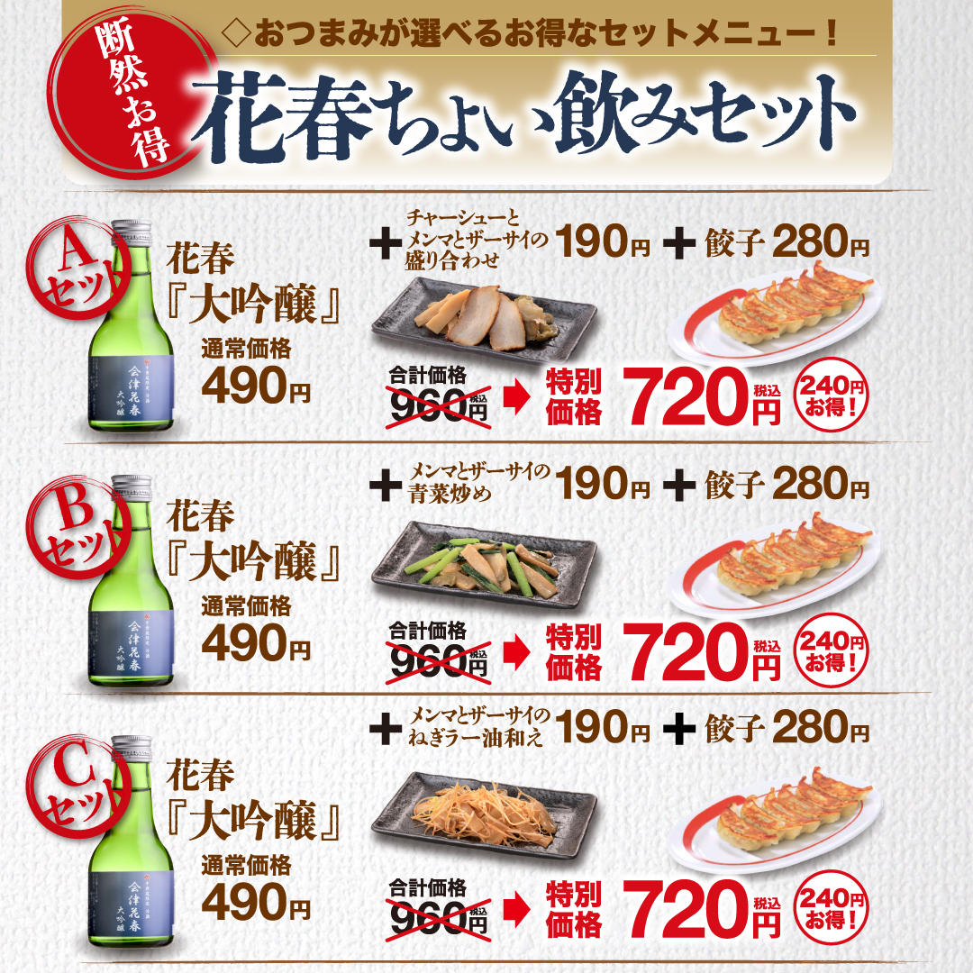 「会津花春〈大吟醸〉」、おつまみ(3種類から選択)、餃子をあわせて、通常合計価格960円のところ720円(240円お得)で提供されます。