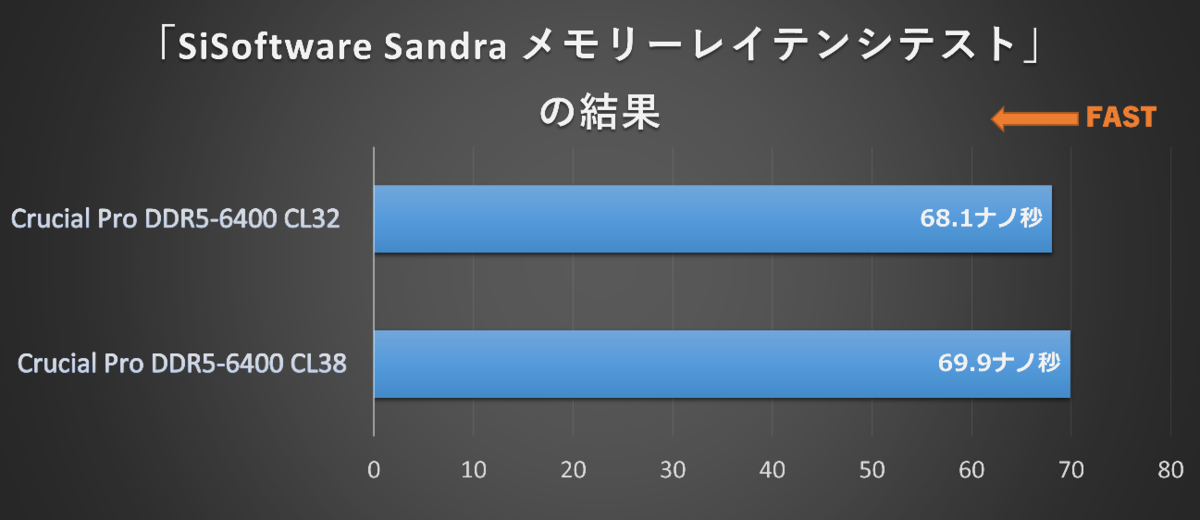結果は、CL32が68.1ナノ秒、CL38が69.9ナノ秒となり、実測であってもきちんと差が出ることがわかった。