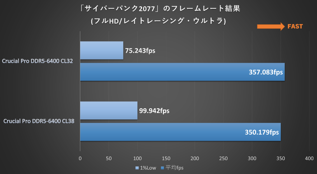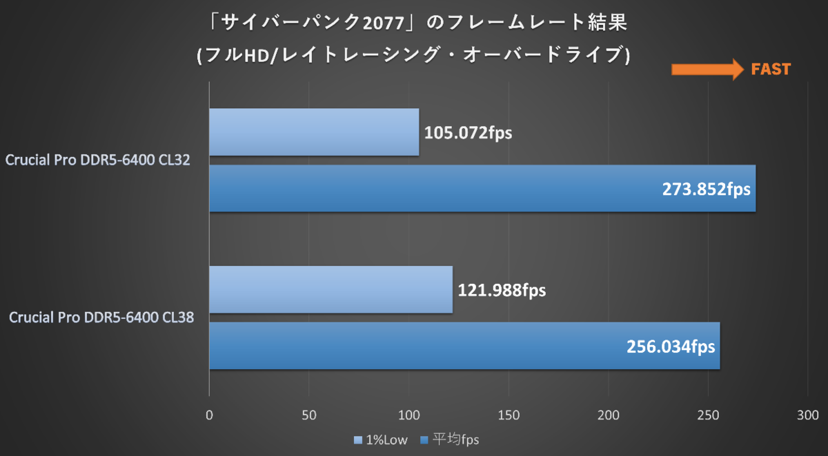 結果は、レイトレーシング・ウルトラ、レイトレーシング・オーバードライブの設定で、いずれもCL 38のメモリーよりフレームレートが高いという結果になった。メモリーのレイテンシーの違いだけでも、フレームレートに差が生まれるということがわかる。