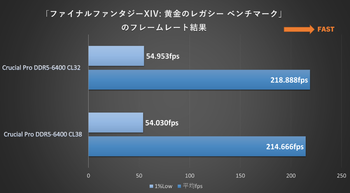 もう1つ、「ファイナルファンタジーXIV: 黄金のレガシー ベンチマーク Ver. 1.1」でも同様のテストを行なった。解像度はフルHDでグラフィックスの設定は「最高画質」で行なっている。