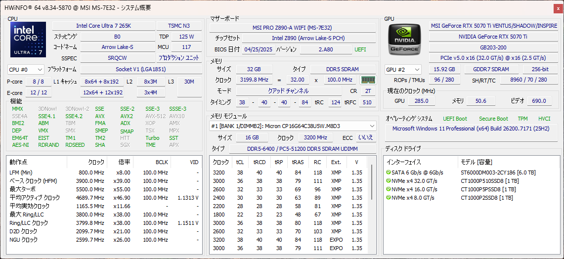 | マザーボード | MSI「PRO Z890-A WIFI」 |