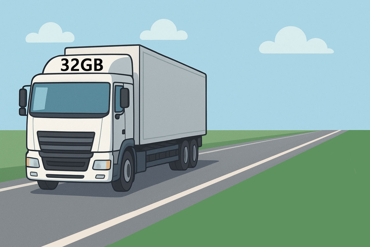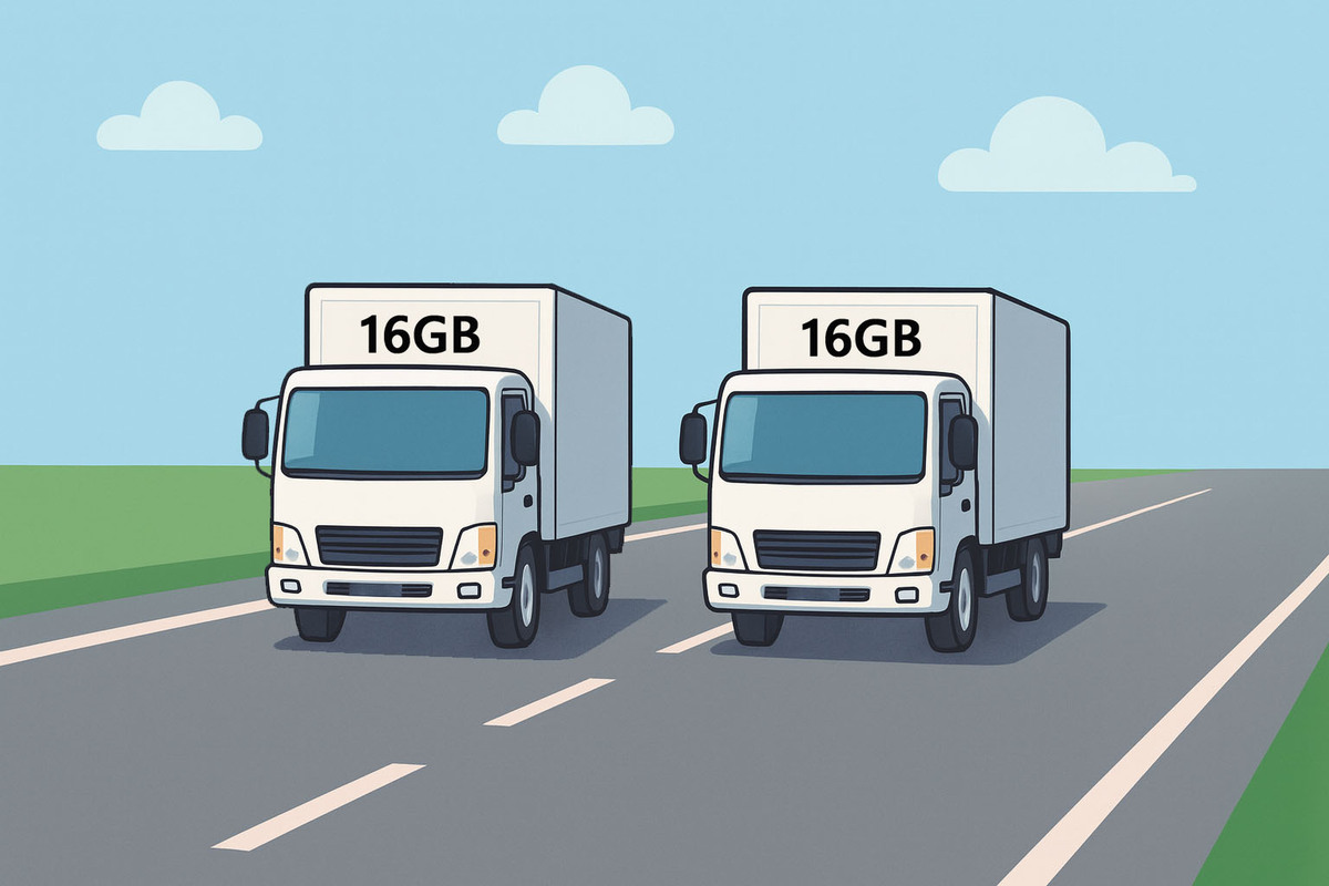 パソコンのデータ転送を道路の交通量に例えるならば、メモリーの容量(16GBや32GB)はトラックの積載量であり、デュアルチャネルかどうかは道路の車線数にあたる。もし32GBのメモリーを1枚だけ挿した場合、「大型トラックが1台、1車線の道路を走っている」状態にあたる。一度にたくさんの荷物を積めるが、道が狭いため、荷物の積み下ろしに時間がかかると渋滞(ボトルネック)が起きてしまう。