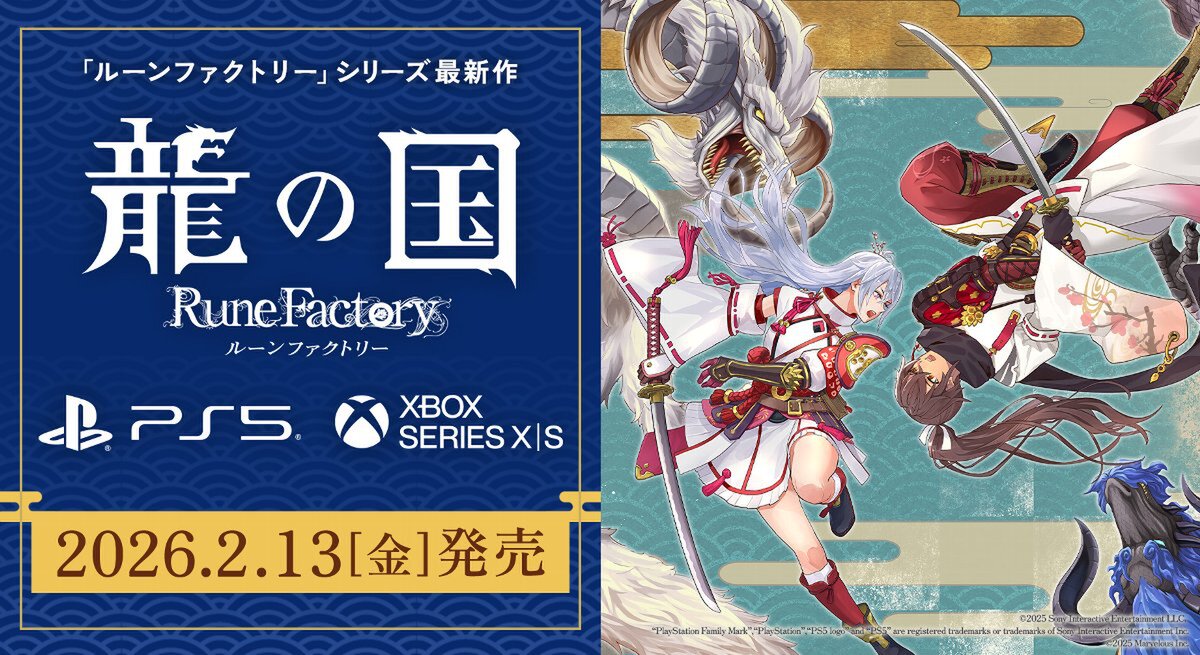 マーベラスは12月9日、「ルーンファクトリー」シリーズ最新作『龍の国 ルーンファクトリー』のPlayStation 5/Xbox Series X|S版の発売日を発表。発売日は2026年2月13日、価格は通常版のパッケージ版/ダウンロード版が7678円だ。そのほかのエディションも用意されているので、後述のゲーム情報を確認してほしい。