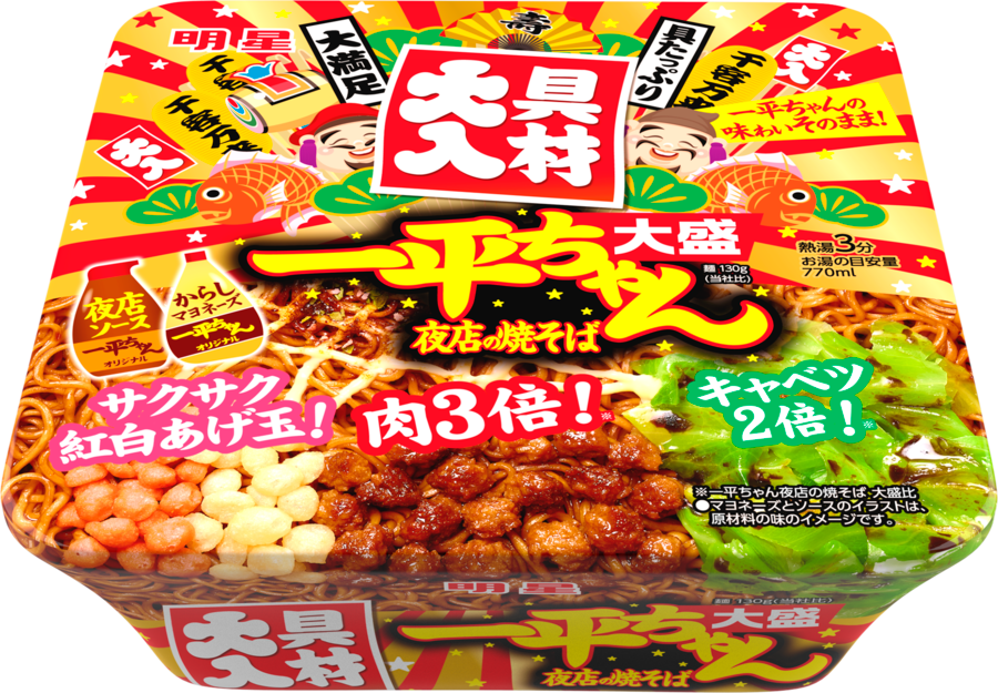 今回は30周年の締めくくりとして、感謝と年末年始のお祝いの気持ちを込めた「明星 一平ちゃん夜店の焼そば 大盛 具材大入」を発売する。