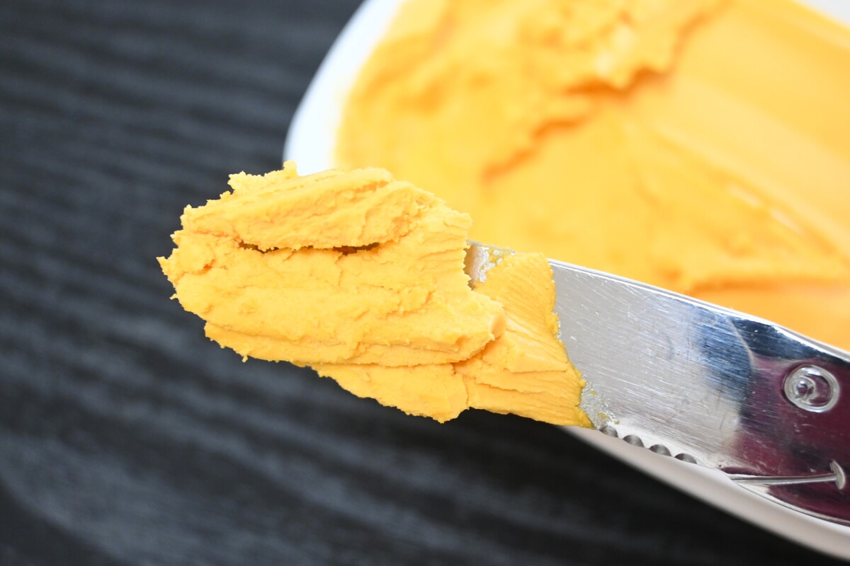 ナイフですくってみます。質感は思ったよりやわらかく、とてもなめらか。少し冷蔵庫の外においておいたからかもしれません。これはパンにも塗りやすく使いやすそう。