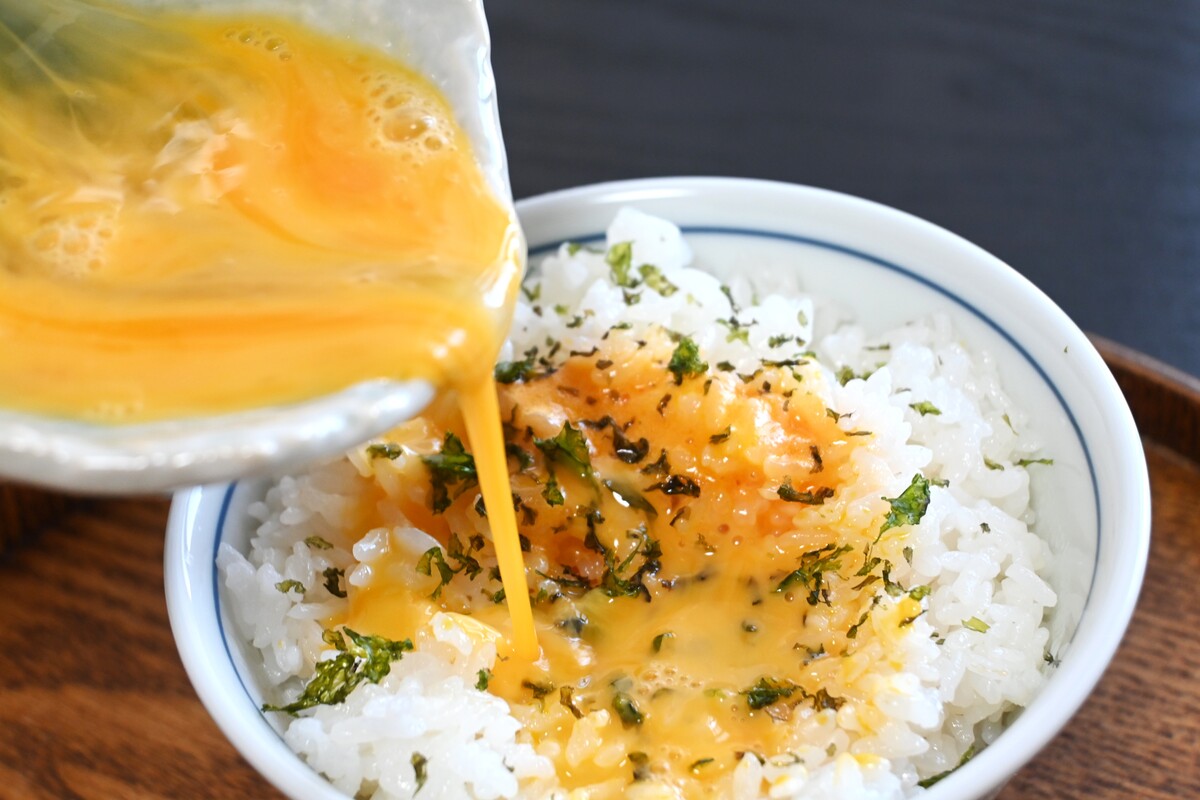 多幸感がある味わいである一方、バター×うにの味わいは、食べ続けていくと少しもたれてしまうので、溶き玉子をかけて後からTKG(玉子かけご飯)にしてみました。