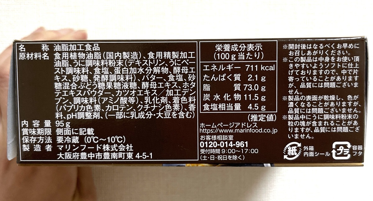 「うにバターブレンド 95g」は、マーガリンやチーズなどの乳製品を手掛けるマリンフードによる“塗るタイプのバター”シリーズのひとつです。もともとは2022年に「うにバター」という名称で登場し、その贅沢さや商品としての意外性が注目を集めました。2024年にはテクスチャーの改良や価格の見直しが行われ、より日常的に使いやすい「うにバターブレンド」としてリニューアルされています。