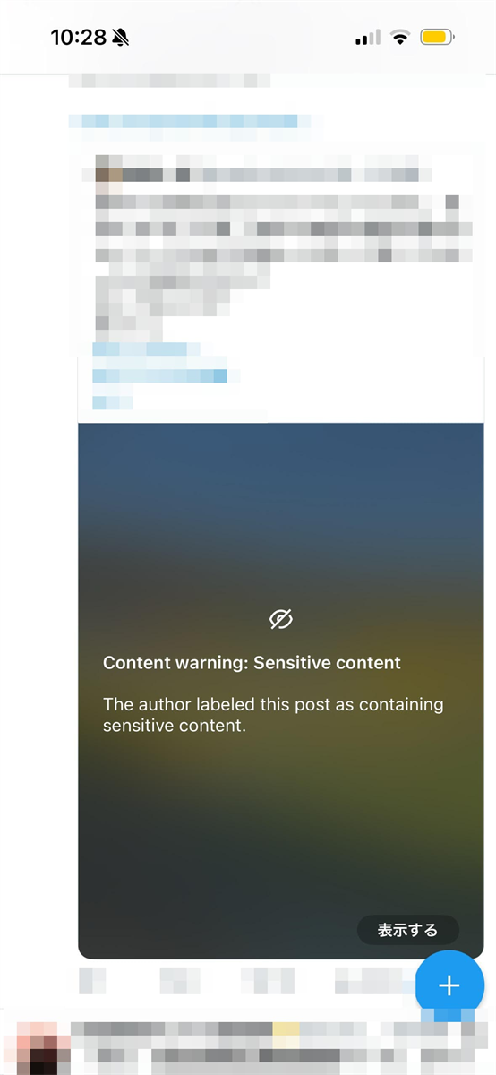 センシティブ投稿と判断されると画像にぼかしが入り、同時に「Content warning: Sensitive content」と注意書きが出るようになる。画像を見たい場合は、「表示する」をタップするだけで見られる。なお、表示されるのはタップした画像のみであり、ほかのセンシティブ投稿はぼかし表示のままだ。