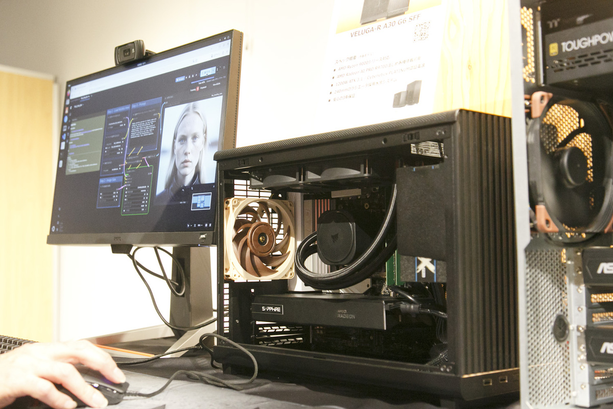 スペックは9070XTとほぼ同じで、VRAMを32GBに増量。佐藤氏は「ベース機を改良した製品なので、コストを抑えることに成功した」と語った。この製品は最大4枚まで挿せるのが特徴。それぞれのVRAMをひとつのメモリーとして認識させられるので、128GBのVRAMとして運用できる。これによって、専門家が使うような大きなLLM(大規模言語モデル)を使えるとのこと。