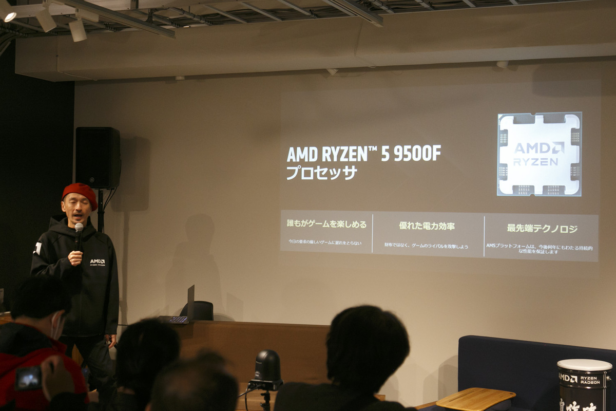 定刻通りイベントが始まると、まずはAMD佐藤氏によるトークショー「2025 AMD製品振り返り」がスタート。冒頭の挨拶で、12月5日に発売されたばかりの製品「AMD Ryzen 5 9500F」を紹介した。