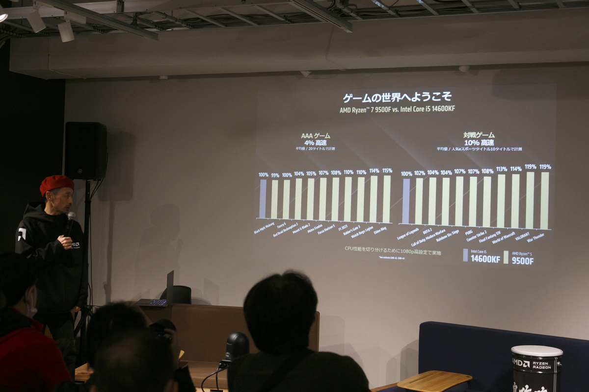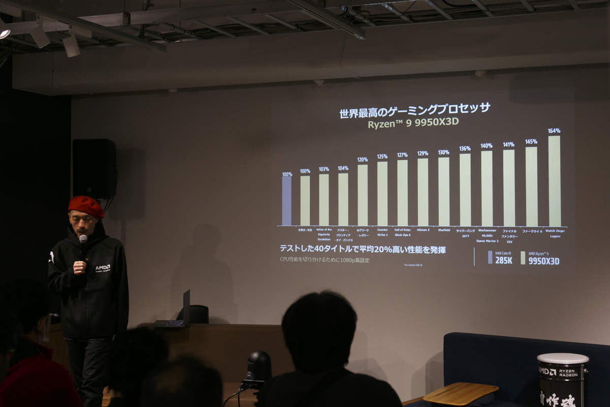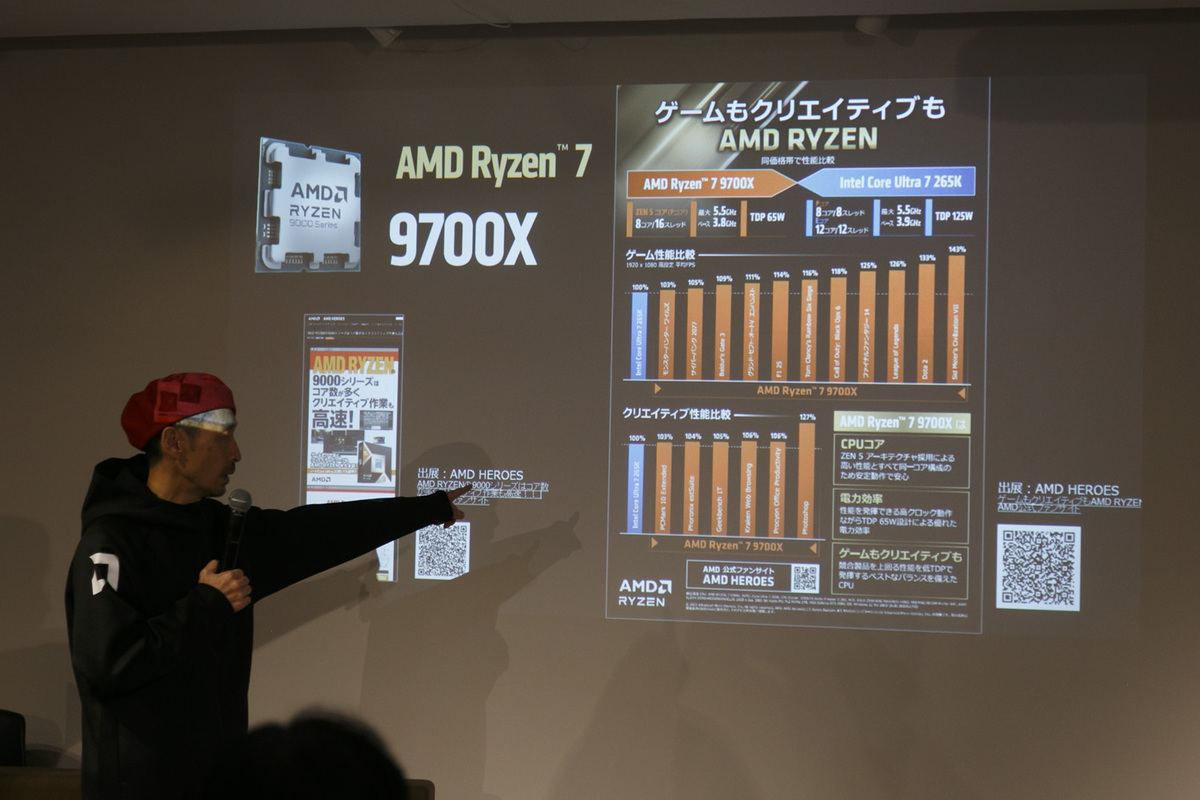 その発言を裏付けるように「Core i9 285K」と比較したグラフを紹介。ゲーム性能でもクリエイティブツール性能でも勝っていた。佐藤氏は「いまはハードウェアに詳しいクリエイターほどRyzenを使っている。これは流行りではなく実績。特に(エンコードやレンダリングなどで)CPUをずっと回し続けるとき、Ryzenのほうが安定しているから選ばれている」とコメントした。