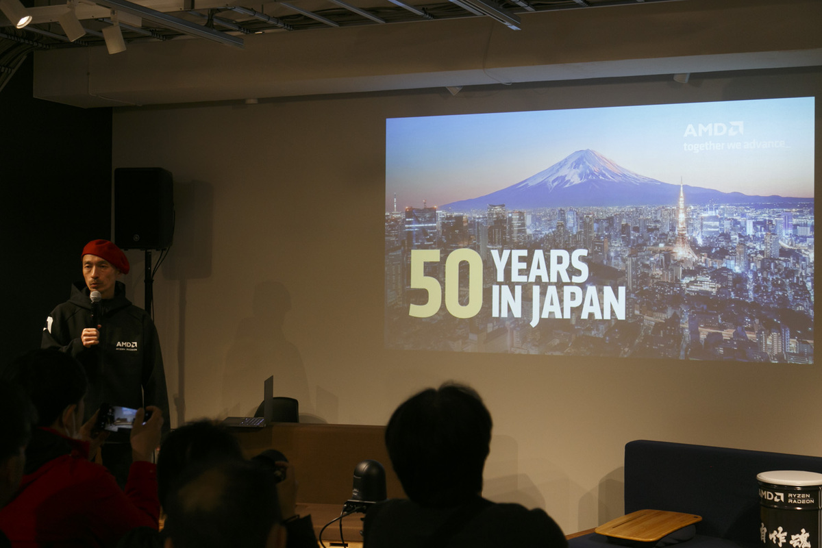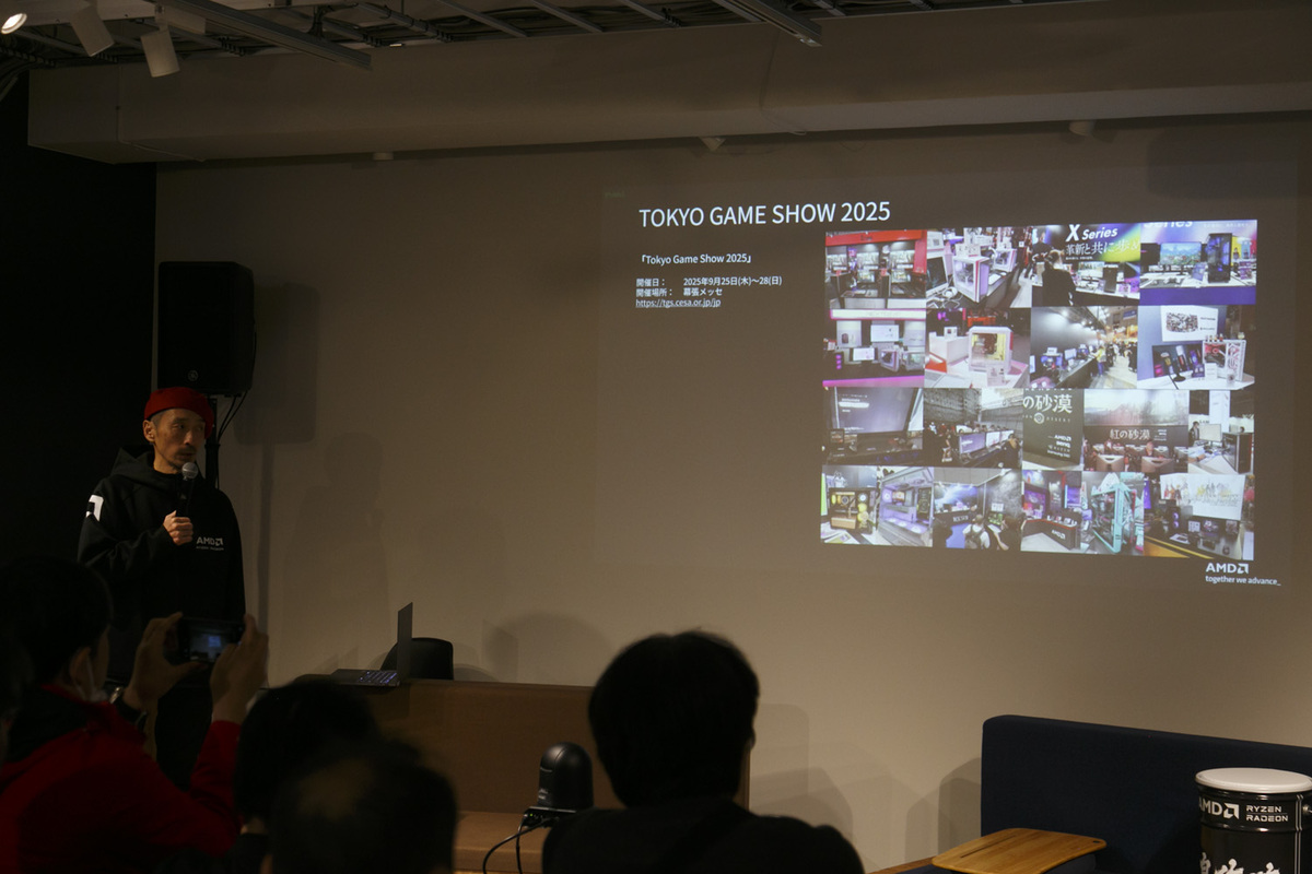 トークショーの本題に入り、佐藤氏が2025年を振り返る。まっさきに挙げた出来事は日本のAMDが50周年を迎えたこと。そして、東京ゲームショウ2025の試遊機でAMDのシェアが大幅に上がったことだった。東京ゲームショウに関しては、「紅の砂漠」のブースにAMD Ryzen+Radeon搭載PCが100台も稼働していたそうだ。